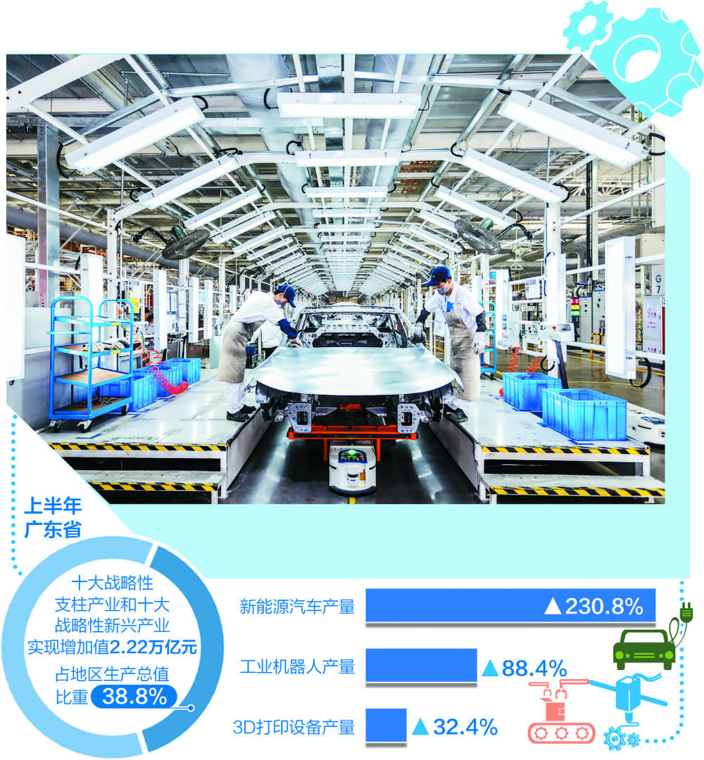 值得关注的是,广东战略性产业集群发展不断提速,上半年全省十大战略性支柱产业和十大战略性新兴产业共有企业16.12万个,实现增加值2.22万亿元,同比增长17.6%;占地区生产总值比重38.8%,比一季度提高1.9个百分点。