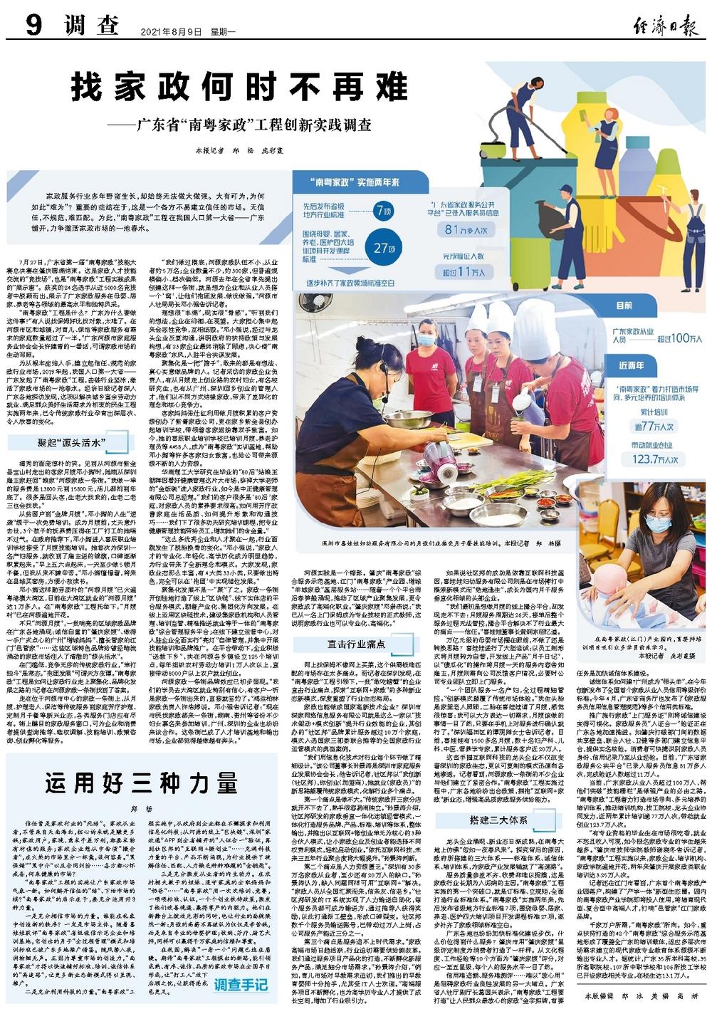河源实践是一个缩影。肇庆“南粤家政”综合服务示范基地、江门“南粤家政”产业园、增城“羊城家政”基层服务站……随着一个个平台雨后春笋般涌现,推动了区域产业聚集发展,更令家政成了高端化职业。“肇庆家嫂”邓崇燕说:“我已从一名上门保姆成为专业技校的正式教师,这说明家政行业也可以专业化、高端化。”