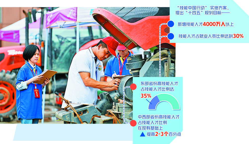 从培养规模来看,“技能中国行动”结合技能人才特点、发展趋势、工作实际等进行了综合分析测算,提出了“十四五”规划目标,包括新增技能人才4000万人以上,技能人才占就业人员比例达到30%,东部省份高技能人才占技能人才比例达到35%,中西部省份高技能人才占技能人才比例在现有基础上提高2个至3个百分点。