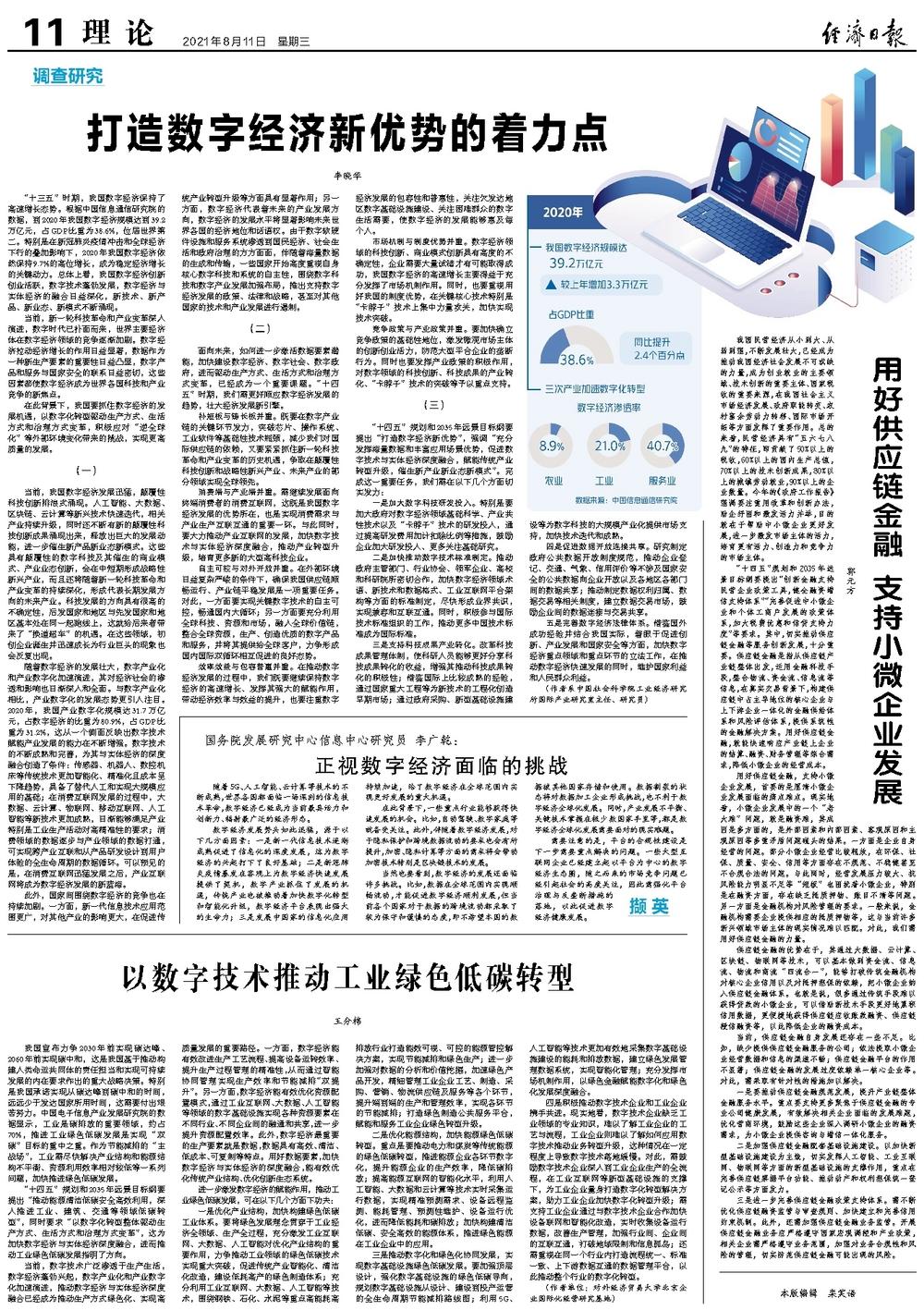 “十四五”规划和2035年远景目标纲要提出“打造数字经济新优势”,强调“充分发挥海量数据和丰富应用场景优势,促进数字技术与实体经济深度融合,赋能传统产业转型升级,催生新产业新业态新模式”。完成这一重要任务,我们需在以下几个方面切实发力: