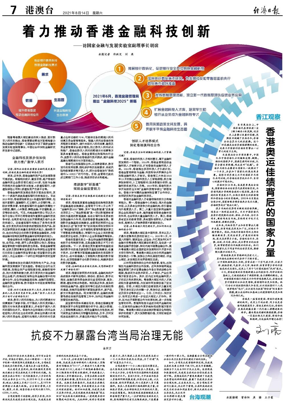 随着粤港澳大湾区建设的深入推进,面对数字人民币的推出,香港需要在哪些方面精准着力推动金融科技创新?记者就此专访了国家金融与发展实验室副理事长、中国社会科学院金融研究所党委书记胡滨。