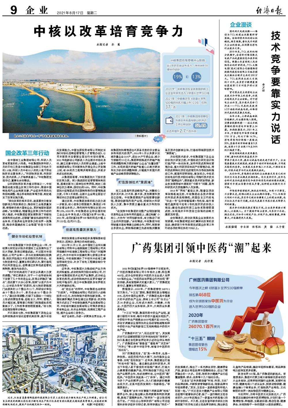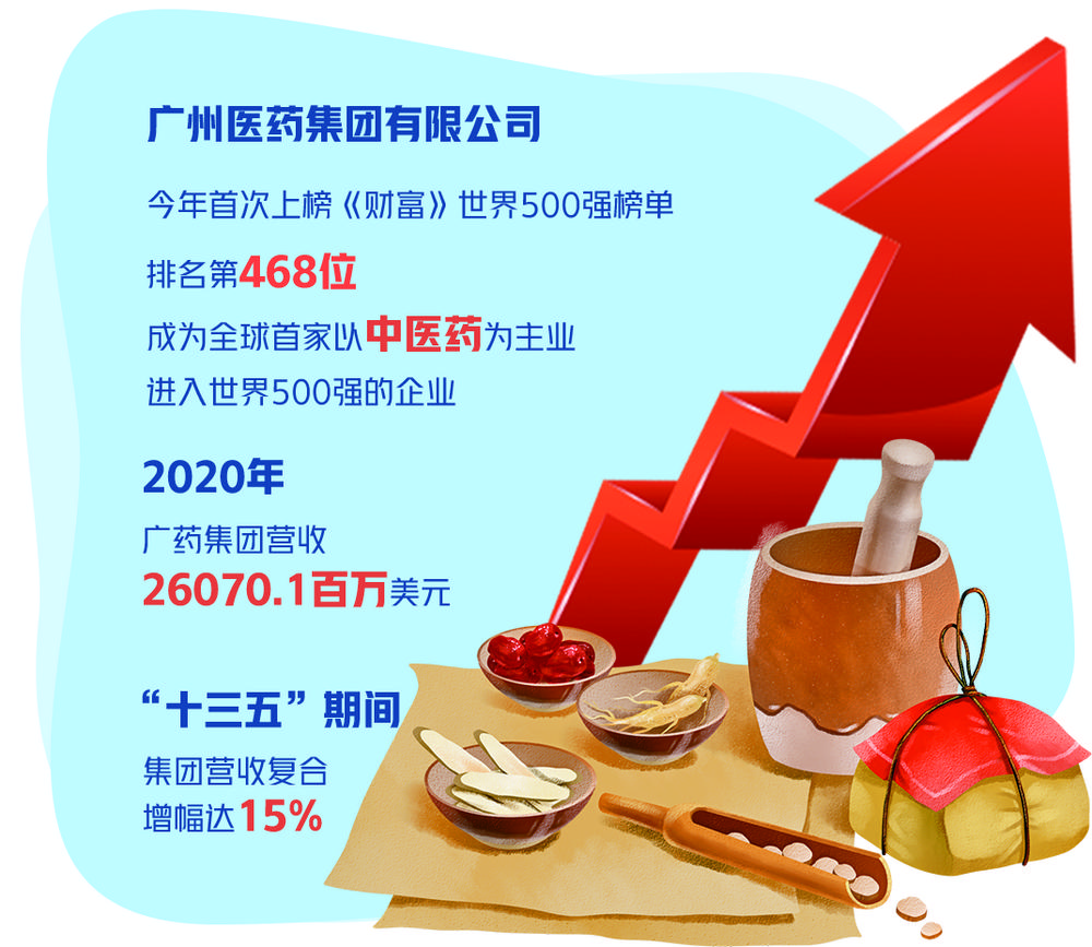 2021年《财富》世界500强榜单于日前发布,广州医药集团有限公司今年首次上榜,排名第468位,成为全球首家以中医药为主业进入世界500强的企业。“中医药在世界强企行列实现‘零’的突破,具有里程碑式的重大意义。”广药集团党委书记、董事长李楚源表示。