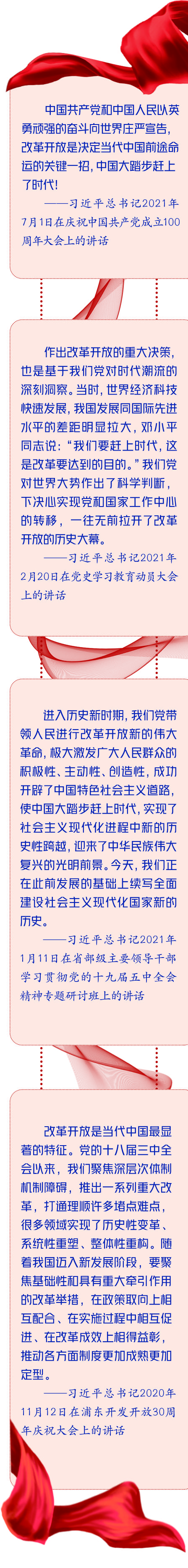 习近平总书记在“七一”重要讲话中指出,我们实现新中国成立以来党的历史上具有深远意义的伟大转折,确立党在社会主义初级阶段的基本路线,坚定不移推进改革开放,战胜来自各方面的风险挑战,开创、坚持、捍卫、发展中国特色社会主义,实现了从高度集中的计划经济体制到充满活力的社会主义市场经济体制、从封闭半封闭到全方位开放的历史性转变,“为实现中华民族伟大复兴提供了充满新的活力的体制保证”。