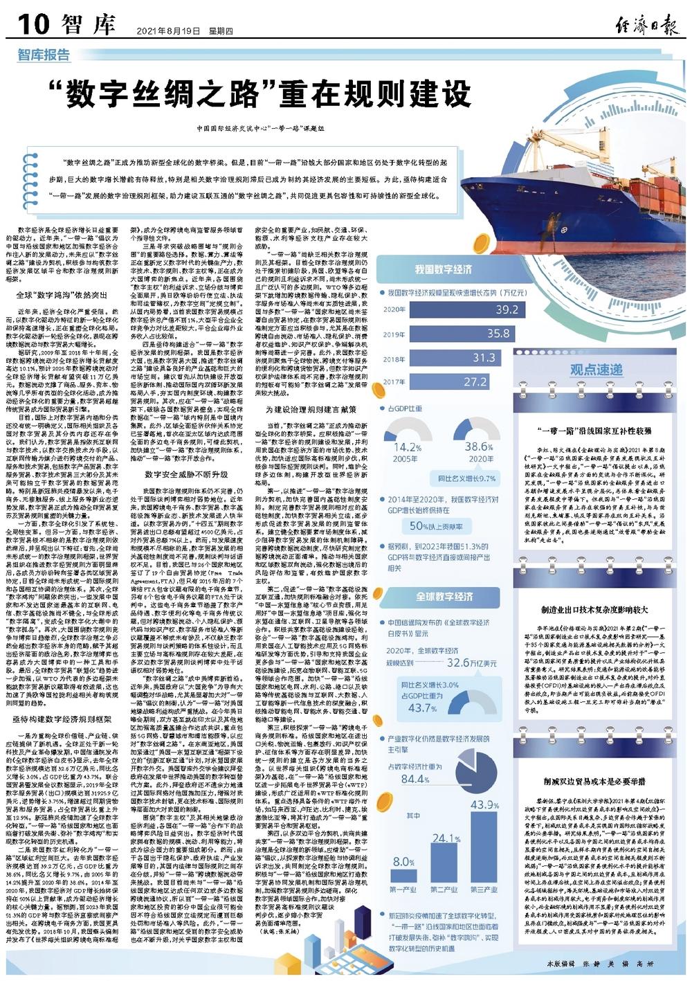 当前,“数字丝绸之路”正成为推动新型全球化的数字桥梁。应积极推动“一带一路”数字经济的规则建设和发展,并利用我国在数字经济方面的市场优势、技术优势,加快适应国际高标准规则步伐,积极参与国际经贸规则谈判。同时,维护全球多边体制,构建开放型世界经济新格局。