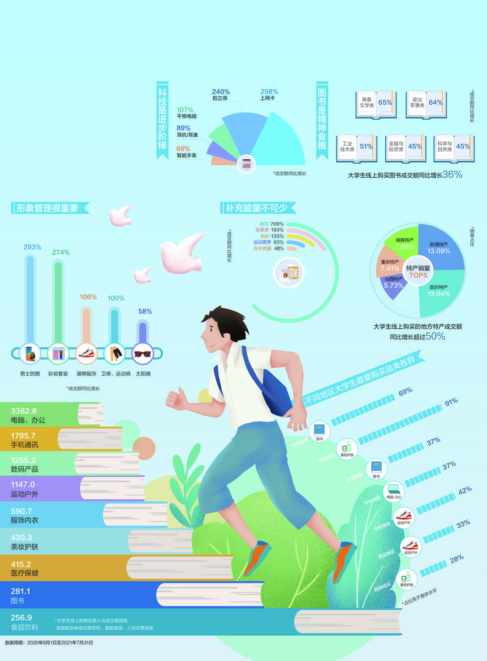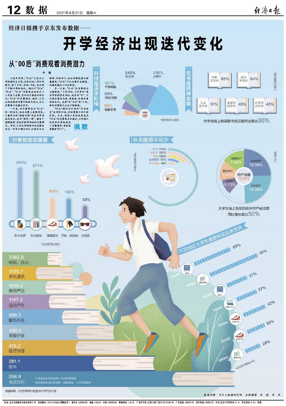 一方面,内外兼修成为“00后”的一种追求,这在消费上表现明显。大量学生把“颜值打理”放在开学准备的首位,追求“焕然一新”,推动了潮牌服饰、美妆护肤等领域的消费增长。同时,大学生网购图书成交额在过去一年同比增长36%,计算机与互联网、外语学习、政治军事类图书销量最高。“00后”不仅注重外在颜值,也越来越关心内在修养。