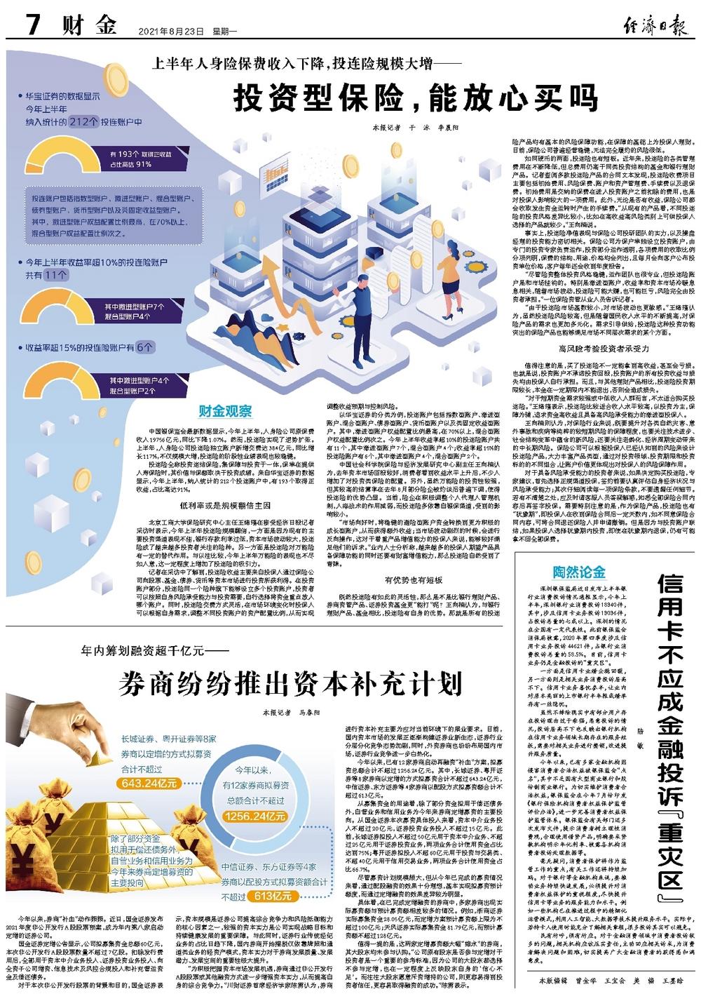 北京工商大学保险研究中心主任王绪瑾在接受经济日报记者采访时表示,今年上半年投连险规模翻倍,一方面是因为现有的主要投资渠道表现不佳,银行存款利率过低,资本市场波动较大,投连险成了越来越多投资者关注的险种。另一方面是投连险对万能险有一定的替代作用。与以往比较,今年上半年万能险的表现也不尽如人意,这一定程度上增加了投连险的吸引力。
