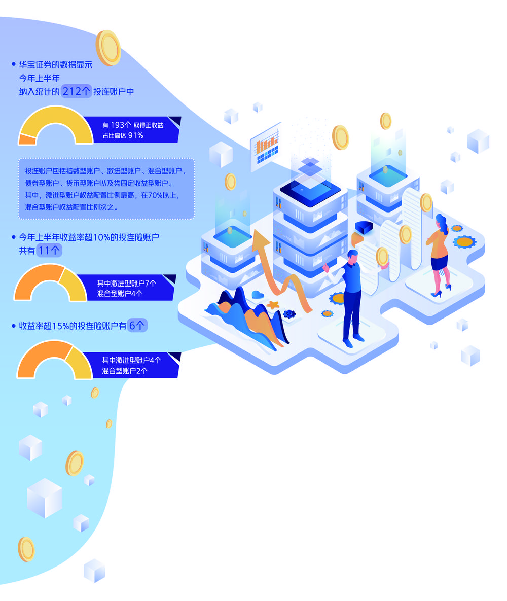 投连险全称投资连结保险,集保障与投资于一体,保单在提供人寿保险时,其价值与保额取决于投资成绩。来自华宝证券的数据显示,今年上半年,纳入统计的212个投连账户中,有193个取得正收益,占比高达91%。