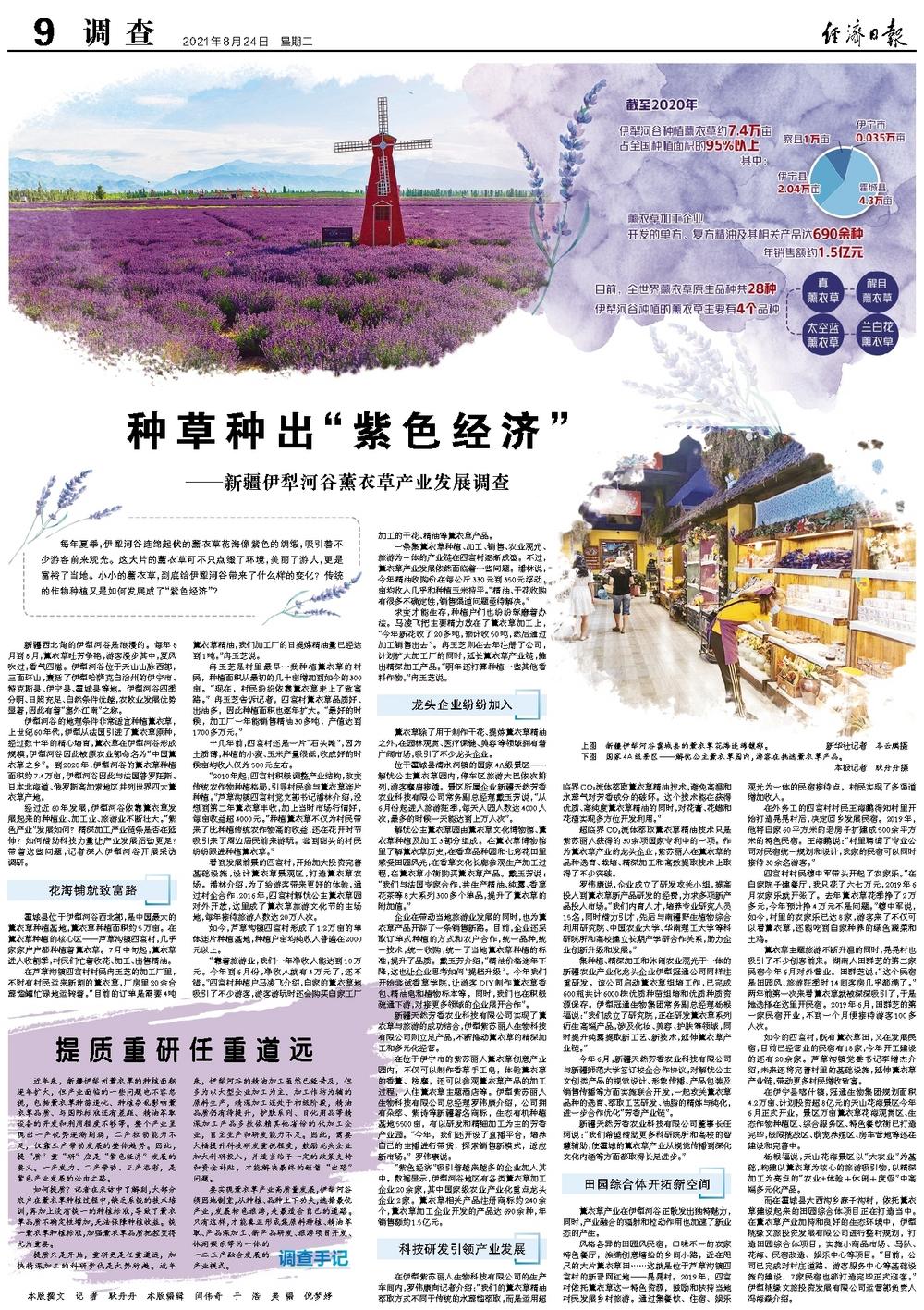 新疆天然芳香农业科技有限公司实现了薰衣草与旅游的成功结合,伊犁紫苏丽人生物科技有限公司则立足产品,不断推动薰衣草的精深加工和多元化经营。
