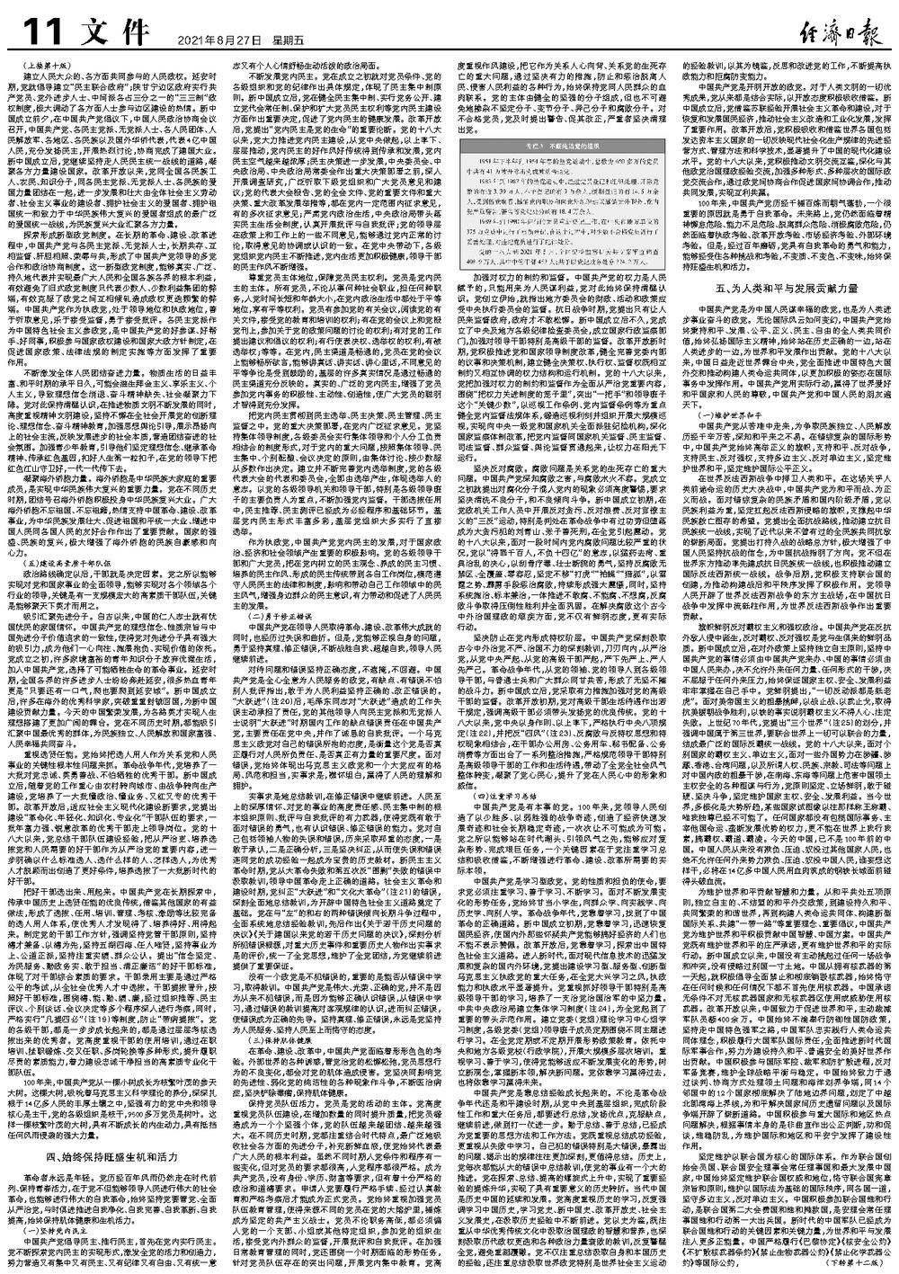 实事求是地总结教训,在修正错误中继续前进。人民至上的深厚情怀、对党的事业的高度责任感、民主集中制的根本组织原则、批评与自我批评的有力武器,使得党既有敢于面对错误的勇气,也有认识错误、修正错误的能力。党对自己包括领袖人物的失误和错误,历来采取郑重的态度,一是敢于承认,二是正确分析,三是坚决纠正,从而使失误和错误连同党的成功经验一起成为宝贵的历史教材。新民主主义革命时期,党从大革命失败和第五次反“围剿”失败的错误中汲取教训,领导中国革命走上正确的道路。社会主义革命和建设时期,党纠正“大跃进”和“文化大革命”(注21)的错误,深刻全面地总结教训,为开辟中国特色社会主义道路奠定了基础。党在与“左”的和右的两种错误倾向长期斗争过程中,全面系统地总结经验教训,先后作出《关于若干历史问题的决议》《关于建国以来党的若干历史问题的决议》,深刻分析所犯错误根源,对重大历史事件和重要历史人物作出实事求是的评价,统一了全党思想,维护了全党团结,为党继续前进提供了重要保证。
