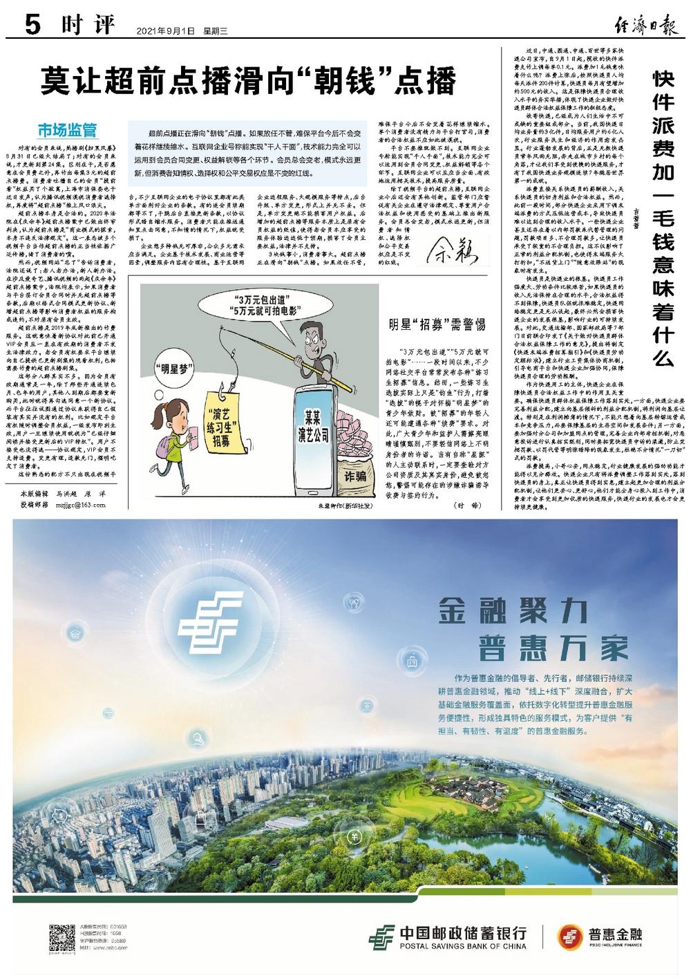 近日,中通、圆通、申通、百世等多家快递公司宣布,自9月1日起,揽收的快件派费支付上调每单0.1元。派费加1毛钱意味着什么呢?派费上涨后,按照快递员人均每天派件200件计算,快递员每月有望增加约500元的收入。这是保障快递员合理收入水平的务实举措,体现了快递企业做好快递员群体合法权益保障工作的积极态度。