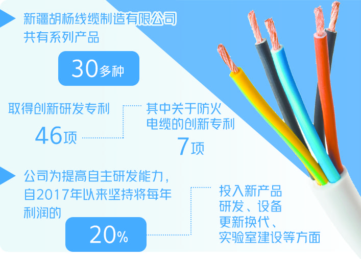如今,新疆胡杨线缆制造有限公司共有30多种系列产品,取得创新研发专利46项,其中关于防火电缆的创新专利7项。新疆胡杨线缆制造有限公司总经理李杰尉说:“我们将继续坚持走专精特新型发展之路,专注于高低压电线电缆、控制电缆、防火电缆、辐照电缆、汽车电缆、光伏电缆等研发和创新,带动企业转型升级,实现高质量发展。”