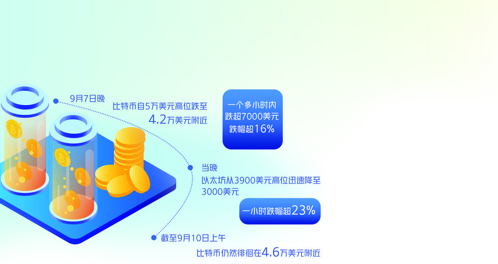 虚拟货币又上演“过山车”行情。9月7日晚,比特币自5万美元高位闪崩至4.2万美元附近,一个多小时内,跌超7000美元,跌幅超16%。以太坊紧随其后,当晚从3900美元高位迅速降至3000美元,一小时跌幅超23%。其他虚拟货币也被带崩,瑞波币、狗狗币均出现下跌。