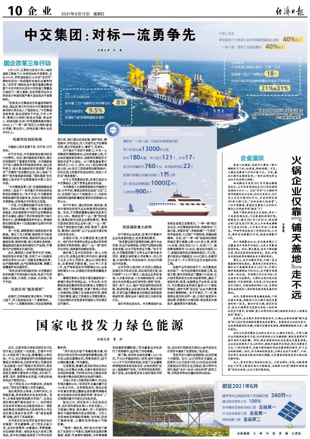 “中交集团是第二批‘交通强国建设试点单位’,担负了一系列重大专项任务研发和前沿课题攻关。”孙子宇说,中交集团将积极构建科技创新体系,加快打造原创技术策源地,实现高水平科技自立自强。