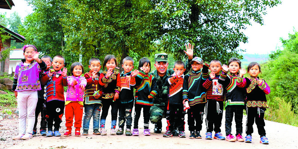 大凉山的脱贫攻坚带头人(组图之一) 作者 李结义 2019年10月10日,四川凉山州昭觉县梭梭拉打村驻村干部布哈与村幼教点的孩子们在一起。