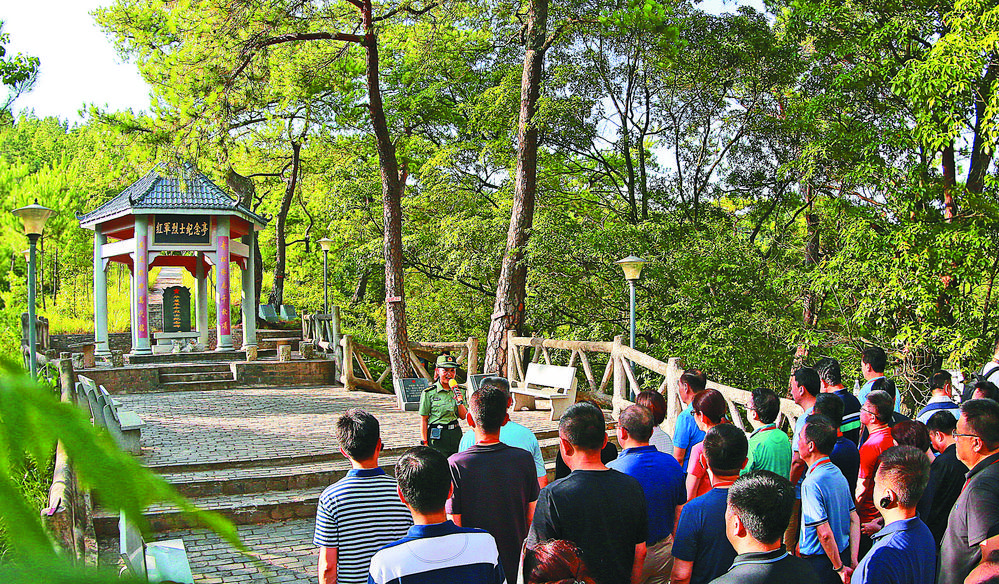 红色村脱贫“密码”(组图之一)作者 刘 青 陈地长 2020年7月20日,江西瑞金叶坪乡黄沙村华屋红军烈士纪念亭前,讲解员为游客讲述革命先烈的故事。依托丰富的红色文化资源和绿色生态资源,华屋着力发展红色旅游和乡村旅游,组建了华屋乡村旅游合作社,吸引农户入社。