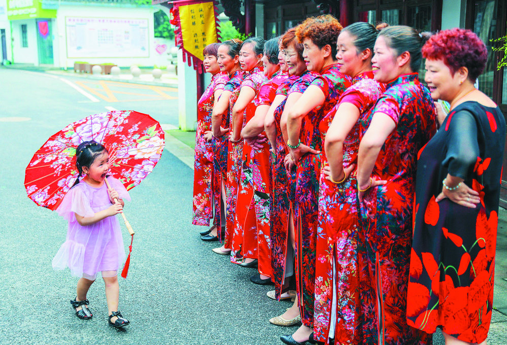 检 阅 作者 陆志鹏 2020年7月18日,浙江湖州市白阜村,小女孩看着村里的大妈走旗袍秀,兴奋地参与其中。