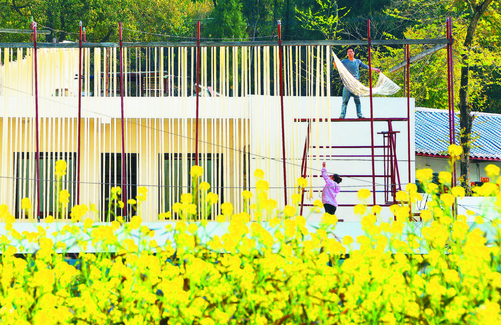 共谱春天致富曲 作者 艾加宪 2020年3月21日,四川中江县觉慧村,家家户户房前屋顶晾晒非遗手工挂面。
