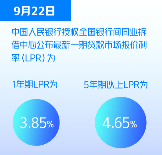 9月22日,中国人民银行授权全国银行间同业拆借中心公布最新一期贷款市场报价利率(LPR)为:1年期LPR为3.85%,5年期以上LPR为4.65%。两项贷款市场报价利率均连续18个月保持这一水平。