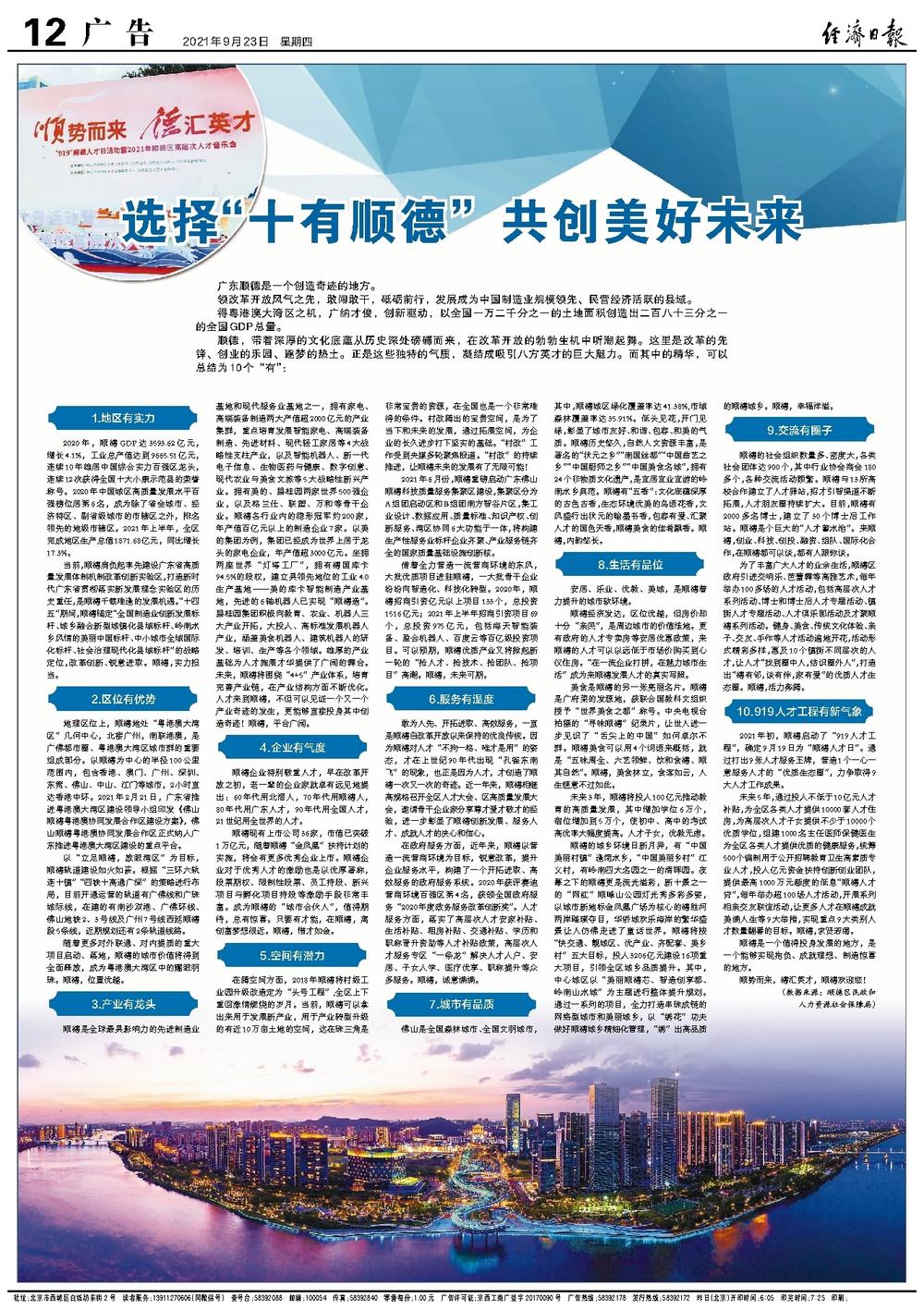 2021年初,顺德启动了“919人才工程”,确定9月19日为“顺德人才日”。通过打出9张人才服务王牌,营造1个一心一意服务人才的“优质生态圈”,力争取得9大人才工作成果。