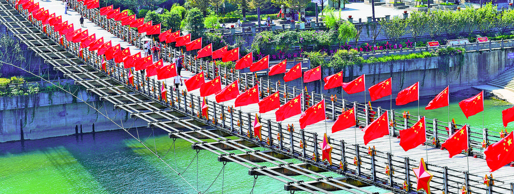 ①10月5日,游客在贵州仁怀市茅台镇茅台渡口铁索桥,缅怀革命先烈,追寻红色印记。陈 勇摄(中经视觉)