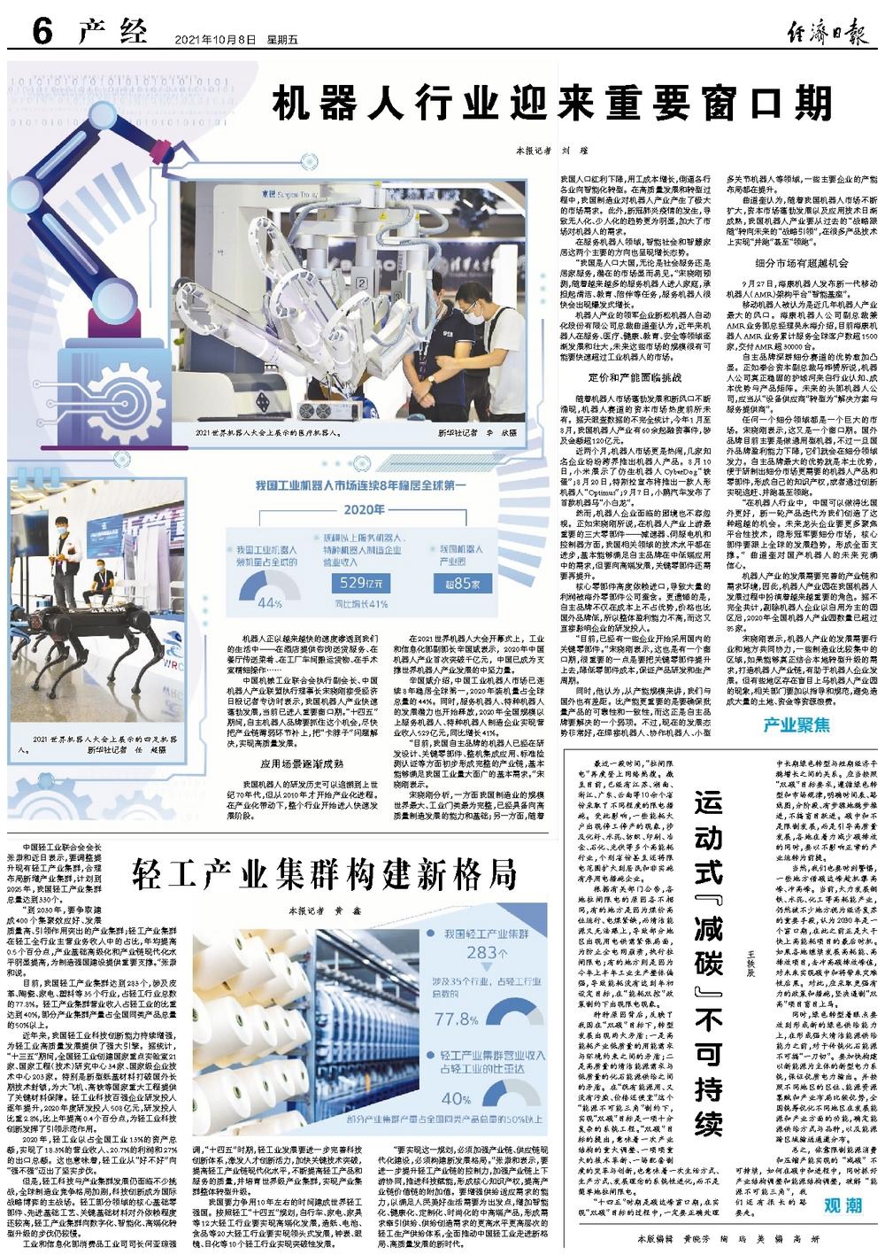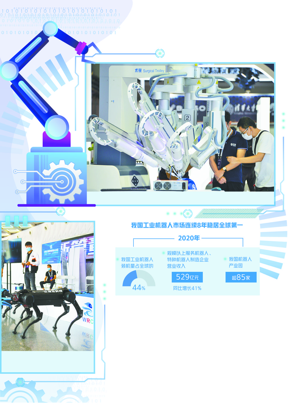 辛国斌介绍,中国工业机器人市场已连续8年稳居全球第一,2020年装机量占全球总量的44%。同时,服务机器人、特种机器人的发展潜力也开始释放,2020年全国规模以上服务机器人、特种机器人制造企业实现营业收入529亿元,同比增长41%。