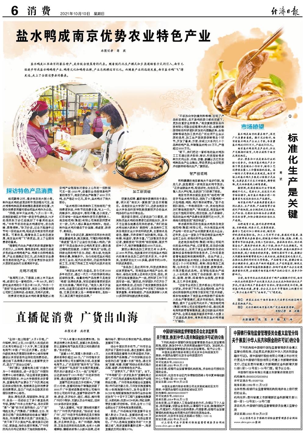 盐水鸭是南京的著名特产,深受广大消费者喜爱。据不完全统计,南京有盐水鸭生产企业上千家,年消费盐水鸭近6000万只,产值近50亿元。