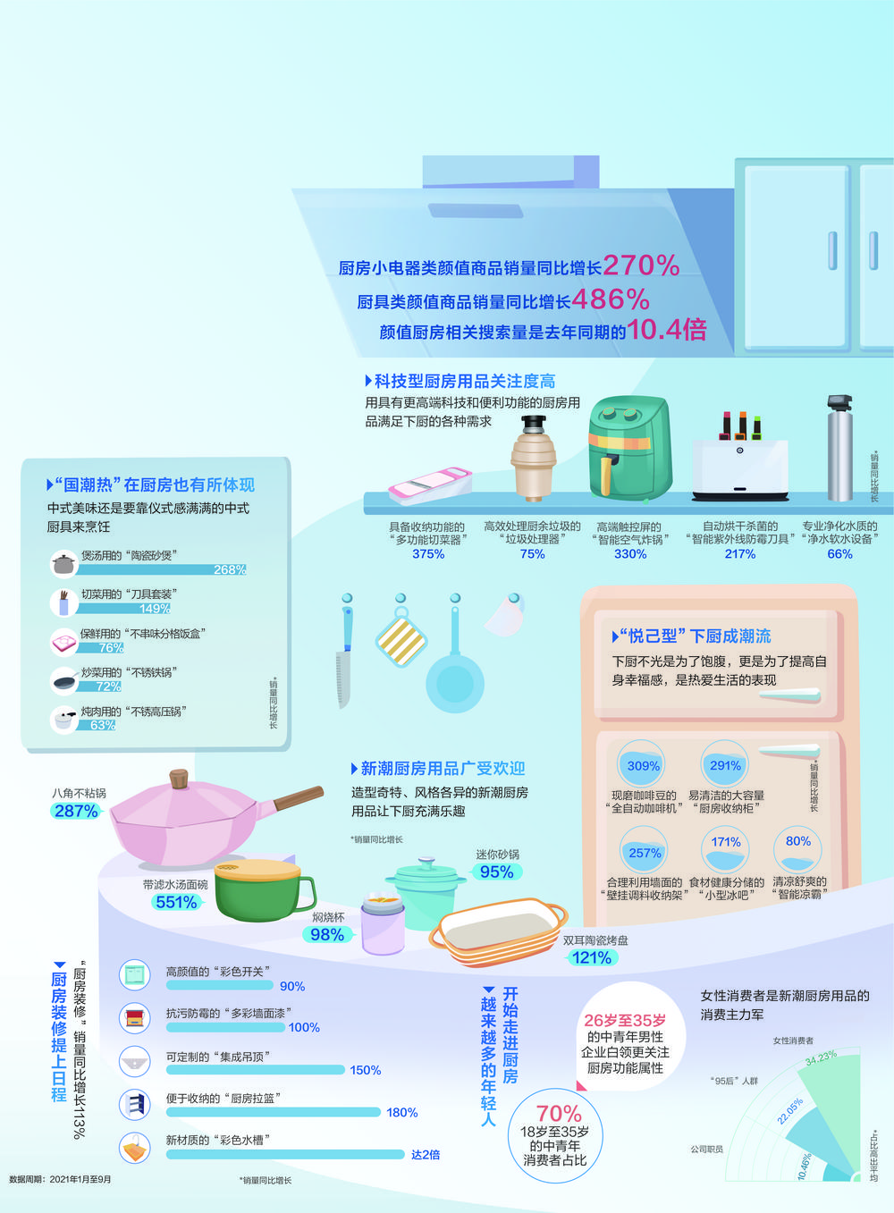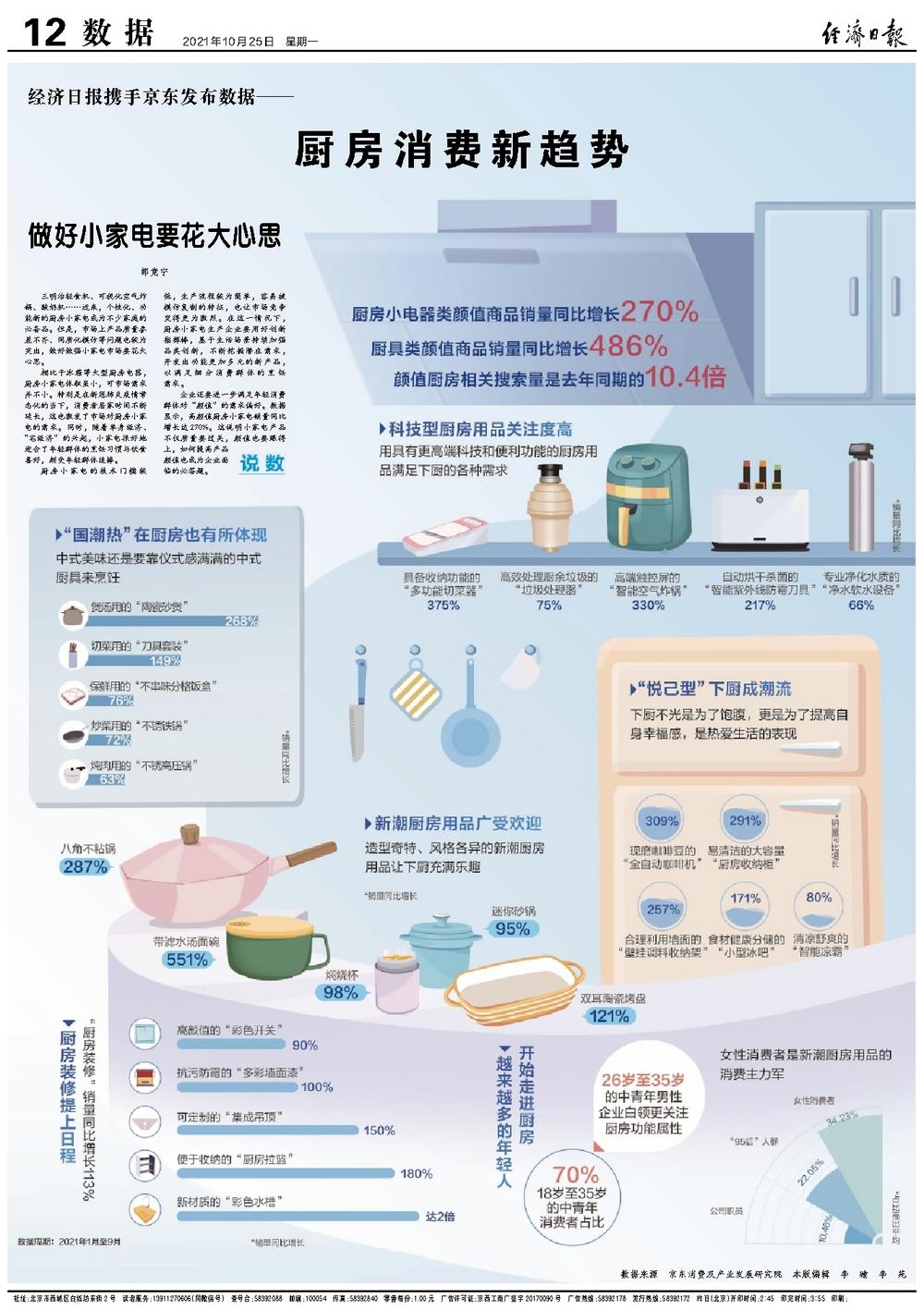 相比于冰箱等大型厨房电器,厨房小家电体积虽小,可市场需求并不小。特别是在新冠肺炎疫情常态化的当下,消费者居家时间不断延长,这也激发了市场对厨房小家电的需求。同时,随着单身经济、“宅经济”的兴起,小家电很好地迎合了年轻群体的烹饪习惯与饮食喜好,颇受年轻群体追捧。