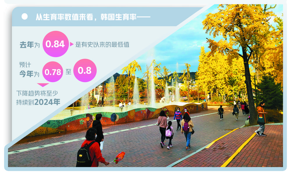 从生育率数值来看,韩国去年的生育率仅为0.84,这是有史以来的最低值,但这一纪录在今年有可能被再次刷新。预计今年韩国生育率仅为0.78至0.8,而且这种下降趋势将至少持续到2024年。