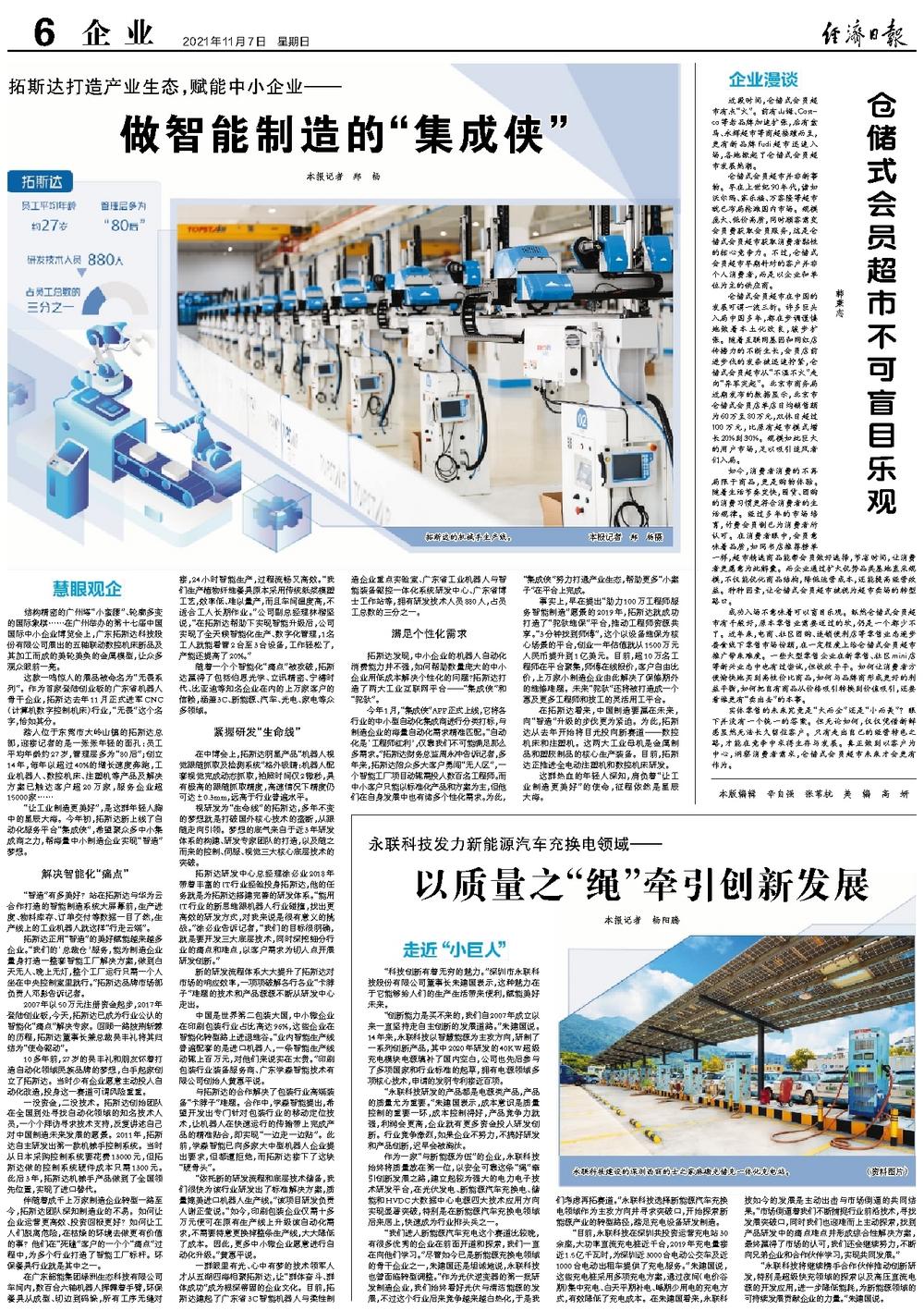 拓斯达研发中心总经理徐必业2018年带着丰富的IT行业经验投身拓斯达,他的任务就是为拓斯达搭建完善的研发体系。“能用IT行业的新思维跟机器人行业碰撞,找出更高效的研发方式,对我来说是很有意义的挑战。”徐必业告诉记者,“我们的目标很明确,就是要开发三大底层技术,同时深挖细分行业的痛点和难点,以客户需求为切入点开展研发创新。”