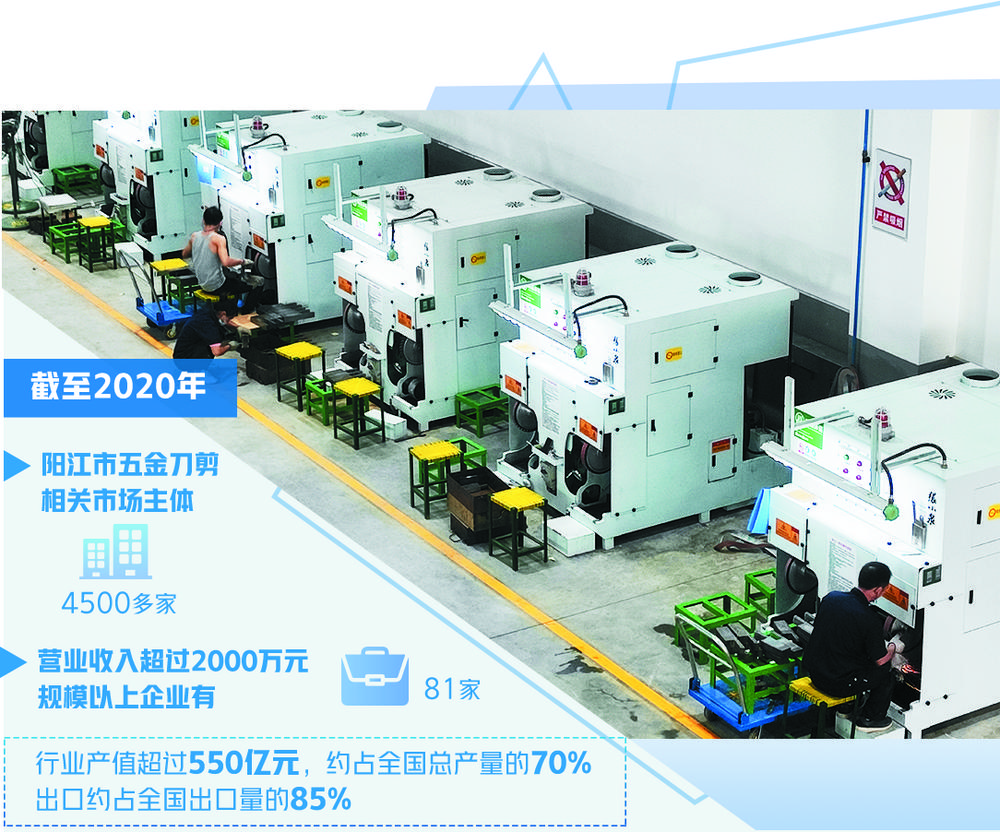 五金刀剪产业是广东省阳江市支柱产业之一,经过多年发展,已经形成中国最大的刀剪产业集群,是著名的“中国刀剪之都”。截至2020年,阳江市五金刀剪相关市场主体有4500多家,从业人员近20万人,营业收入超过2000万元规模以上企业有81家,其中超过5000万元的有29家,亿元规模以上有14家。行业产值超过550亿元,约占全国总产量的70%,出口约占全国出口量的85%。