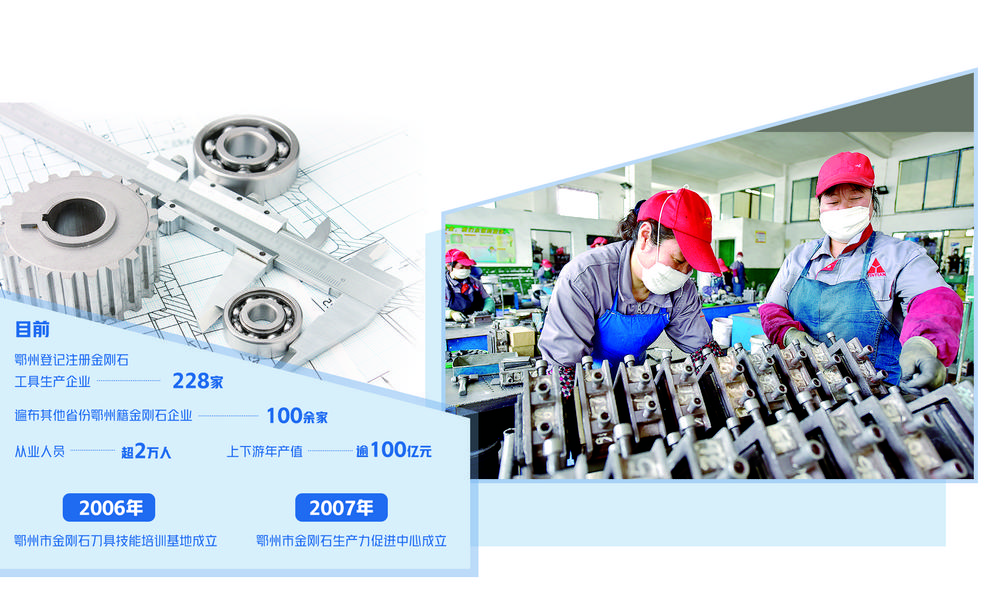 具备一技之长的“鄂州金刚石刀具工”是鄂州金刚石产业发展的基石。经过近40年的市场沉浮,目前鄂州登记注册金刚石工具生产企业228家,遍布其他省份鄂州籍金刚石企业100余家,从业人员超2万人,上下游年产值逾100亿元。