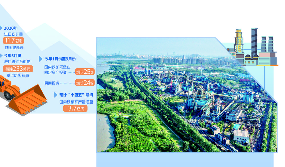 在加快构建新发展格局的背景下,加大国内铁矿石资源开发力度,是维护产业安全的必要之举。在冶金工业规划研究院近日举办的2021(第十届)中国钢铁原材料市场高端论坛上,自然资源部矿产资源保护监督司司长鞠建华指出,“十四五”期间,要加快25个铁矿资源基地建设和28个国家规划矿区勘查开发,构建以大中型矿山为主体的供应格局。确保现有铁矿供应能力稳步提升,积极推进一批资源有保障、区位有优势、产业有基础的铁矿建设项目,保障合理的用矿、用地需求,新增一批优质产能,铁矿石年供应量稳定在3亿吨左右(品位62%)。