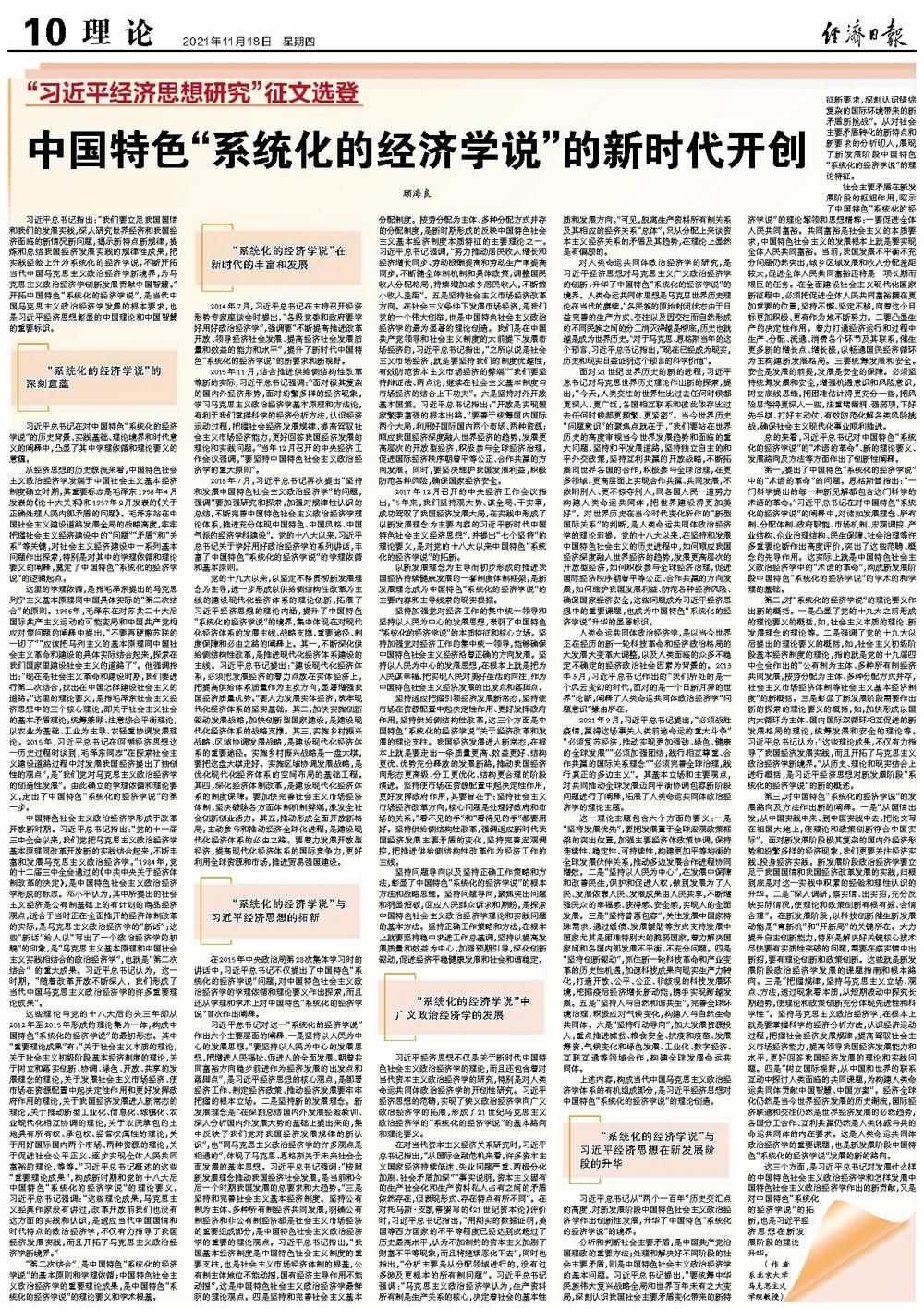 上述内容,构成当代中国马克思主义政治经济学体系的有机组成部分,是习近平经济思想对中国特色“系统化的经济学说”的理论创造。