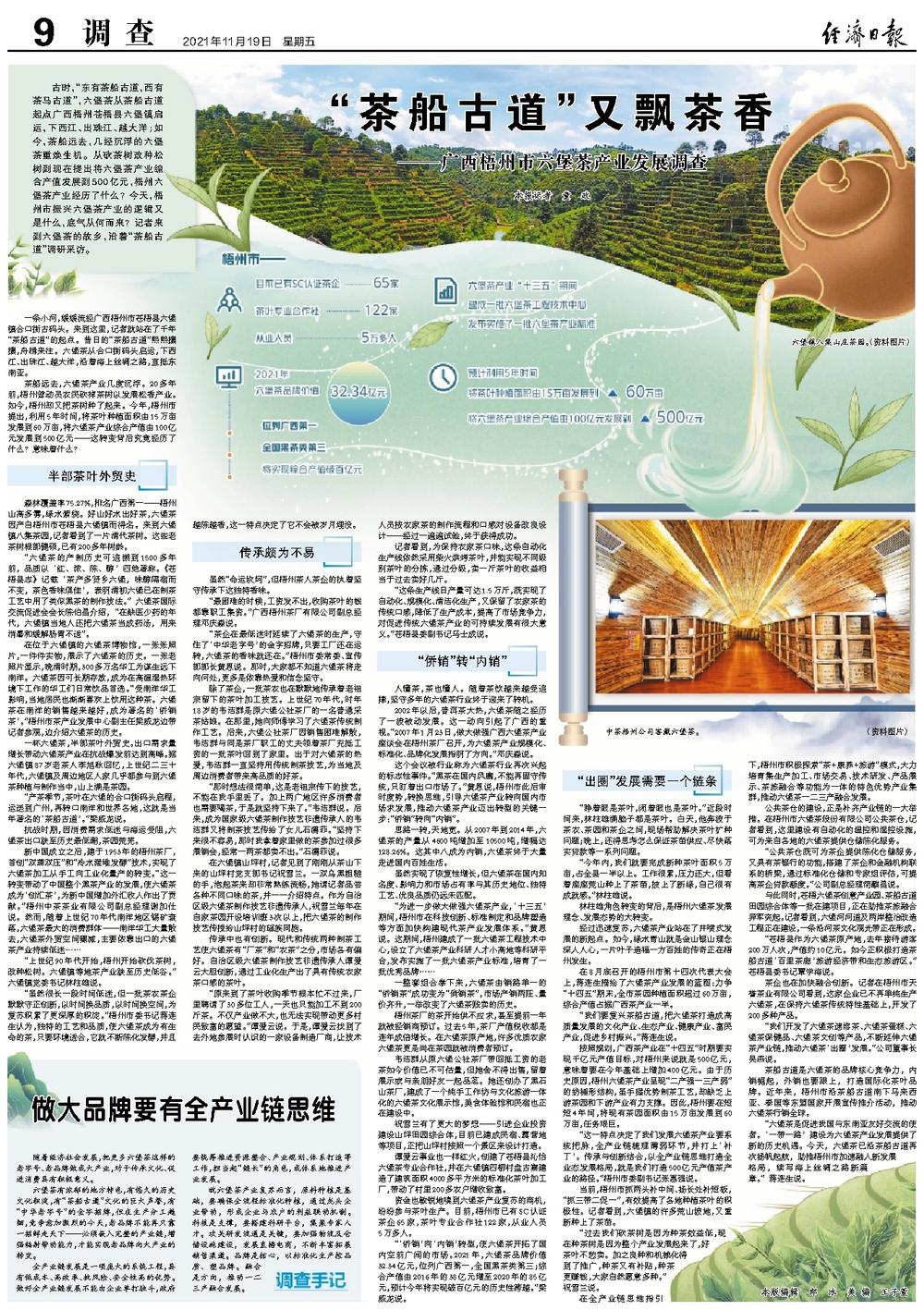 “这一特点决定了我们发展六堡茶产业要系统把脉,全产业链梳理薄弱环节,并打上‘补丁’。传承与创新结合,以全产业链思维打造全业态发展格局,就是我们打造500亿元产值茶产业的路径。”梧州市委副书记张惠强说。