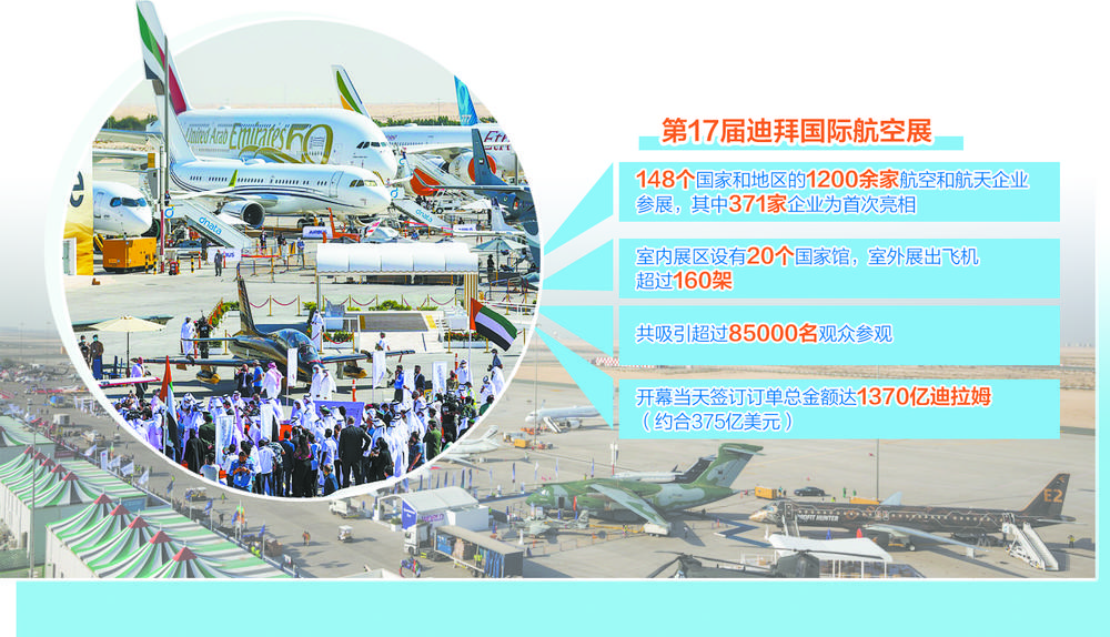 迪拜国际航空展前身为1986年举办的阿拉伯航空展,1989年第一届迪拜国际航空展举行,此后每两年举行一次,目前是中东地区最具影响力的国际航空展。迪拜航展主办方Tarsus Middle East总经理蒂莫西·霍斯表示,2021迪拜航展意义非凡,疫情给航空业带来了深刻变革,迪拜航展更加聚焦于后疫情时代航空业的发展,其中包括科技创新、可持续发展等课题。他同时表示,迪拜航展释放了航空业复苏的积极信号,来自全球各地的参展商、业内专家、参观者在迪拜航展期间深入交流互动,充分体现了行业发展的活力及韧性。据介绍,迪拜航展开幕当天签订的订单总金额便高达1370亿迪拉姆(约合375亿美元)。