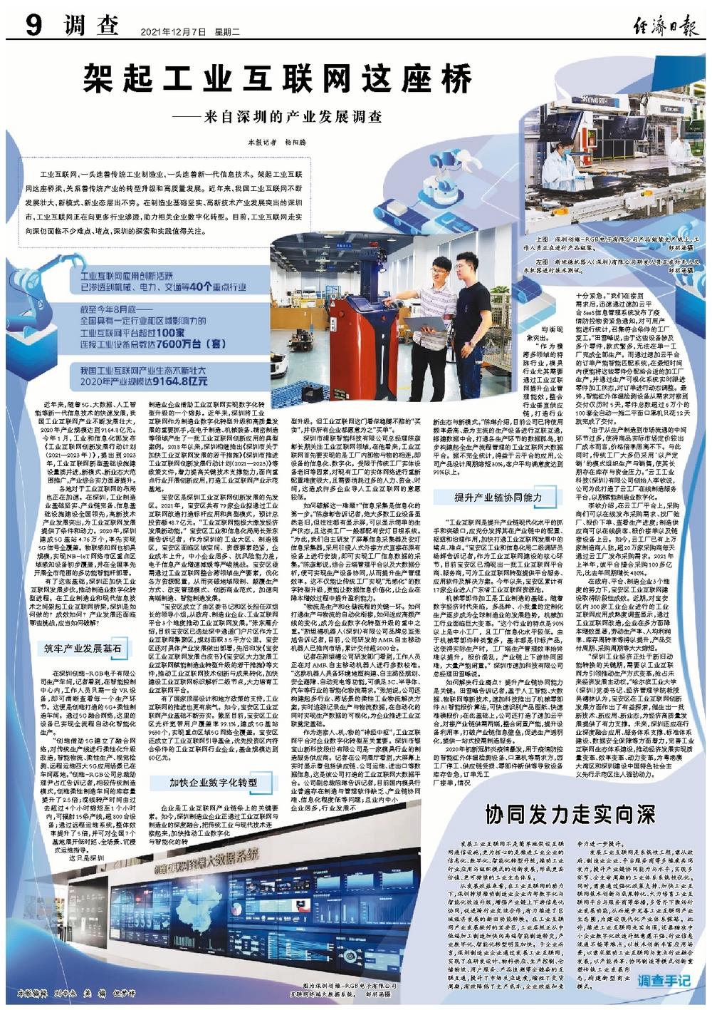 这只是深圳制造业企业借助工业互联网实现数字化转型升级的一个缩影。近年来,深圳将工业互联网作为制造业数字化转型升级和高质量发展的重要抓手,在电子制造、机械装备、精密制造等领域产生了一批工业互联网创新应用的典型案例。2018年以来,深圳相继推出《深圳市关于加快工业互联网发展的若干措施》《深圳市推进工业互联网创新发展行动计划(2021—2023)》等政策文件,着力提高关键技术支撑能力,面向重点行业开展创新应用,打造工业互联网产业示范基地。