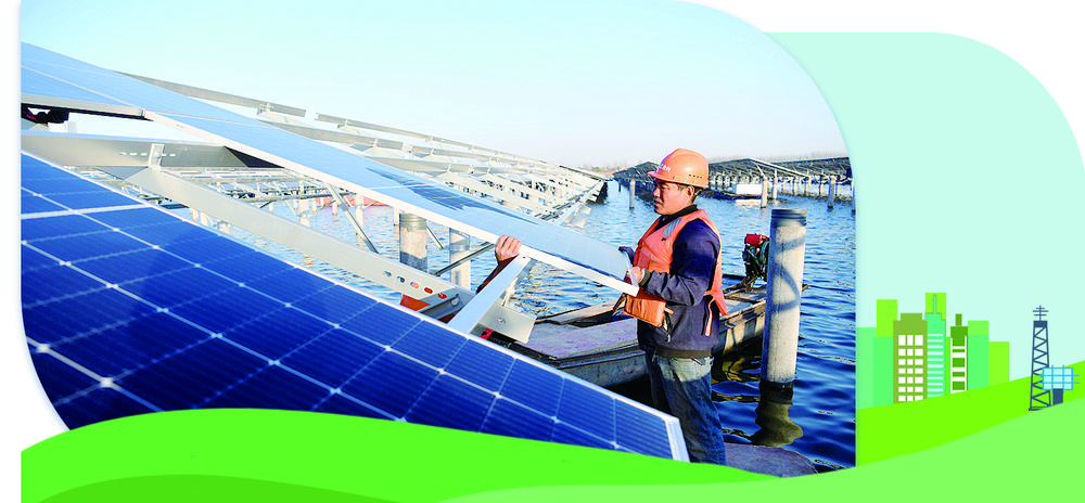 工人在安徽省合肥市肥东县古城镇蒋集水库“渔光互补”光伏电站建设现场安装光伏板。近日,该光伏电站一期正式并网发电。新华社记者
