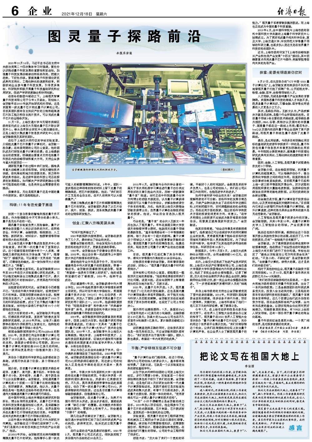 在位于上海交大闵行区的学校实验室里,介绍起光量子芯片和量子计算机时,金贤敏一脸自豪;在尚显简陋的公司办公室里,他的团队成员们深信光量子计算的前景;在上海最新出台的政策里,明确提出要重点支持包括量子科技在内的战略领域和重大方向,支持企业参与重大科技项目……