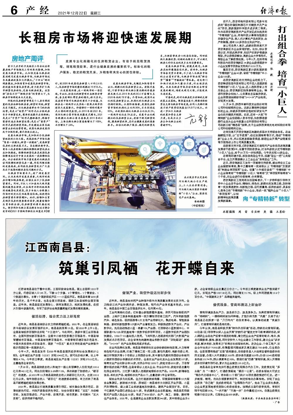 工业向高端化迈进。江铃富山新能源整车基地、济民可信生物医药产业园、上海沪工装备制造基地等一批引爆性项目竣工投产,汽车和新能源汽车、绿色食品、医药医器等3大主导产业持续壮大,集成电路、智能装备制造、新材料新能源等3大新兴产业蓄势发力。积极推进数字产业化、产业数字化,先后启动推进小蓝·泰豪VR产业园、江西移动小蓝数据中心、中国联通VR/AR研究基地等一批数字经济领军项目,小蓝数字经济产业园加快建设,1086个5G基站投入使用,飞尚科技入选国家相关部门大数据产业发展试点示范项目,在全省率先构建制造业和数字经济“双轮驱动”新格局,“3+3+N”的产业发展格局逐步形成。