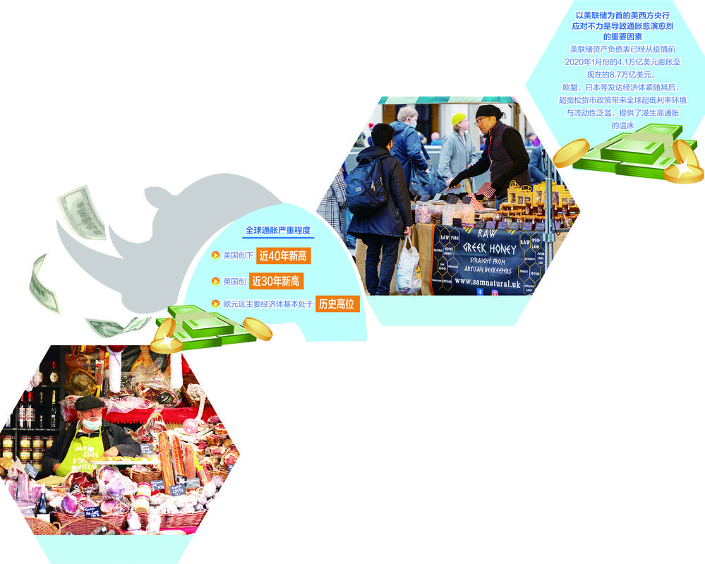 首先,以美联储为首的美西方央行应对不力是导致通胀愈演愈烈的重要因素。一是美联储货币政策框架调整为其对通胀的纵容态度埋下了伏笔。美联储在2020年8月底宣布调整货币政策执行框架,采取“平均通胀目标”,即允许一段时间内超过2%,只需长期下来保持平均2%通胀率即可,更加致力于以就业为目标的经济恢复。当时即有经济学家分析这可能导致恶性通胀和巨额债务。二是面对疫情直接拧开了货币供应的“水龙头”。也许是害怕2008年国际金融危机后美联储反应迟缓招致各方批评这一幕重演,这一次美联储主席鲍威尔在美国前总统特朗普的炮轰之下,提前终结了前任主席耶伦开启的货币政策正常化进程,转而选择“近零利率+‘无上限’量化宽松”的组合拳。数据显示,美联储资产负债表已经从疫情前2020年1月份的4.1万亿美元膨胀至现在的8.7万亿美元。欧盟、日本等发达经济体紧随其后,超宽松货币政策带来全球超低利率环境与泛滥的流动性,提供了滋生高通胀的温床。三是货币政策调整举棋不定。美联储早前一直信誓旦旦地表示,通胀只是“暂时性现象”,而紧盯的就业数据未见起色,同时担忧经济复苏进程和资本市场过度反应,迟迟没有推出有力举措,在不断攀升的通胀数据中饱受质疑。