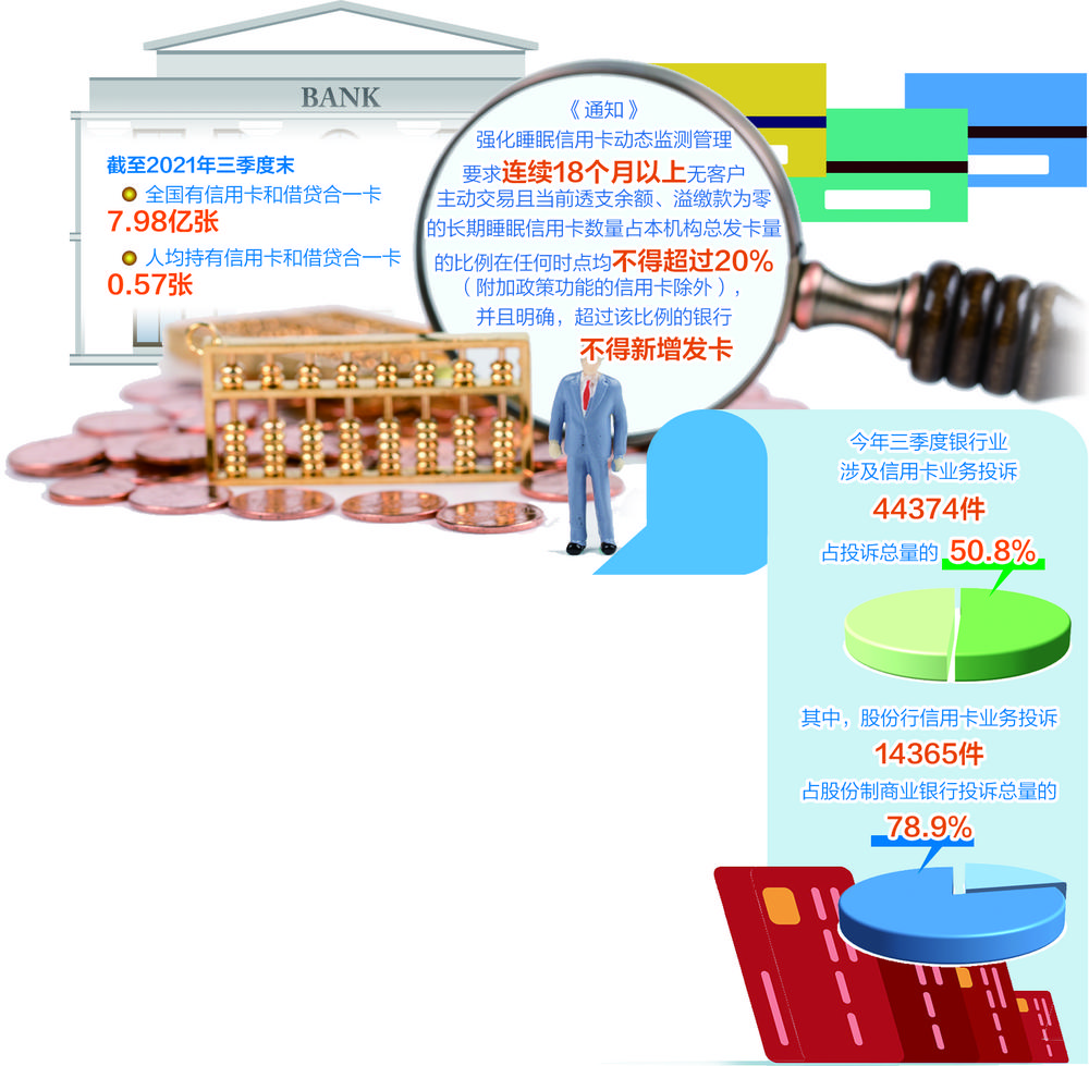 近年来,我国银行业金融机构信用卡业务快速发展,在便利群众支付和日常消费等方面发挥了重要作用。人民银行发布的数据显示,截至2021年三季度末,全国有信用卡和借贷合一卡7.98亿张,人均持有信用卡和借贷合一卡0.57张。发卡量激增的同时,行业乱象也被各界诟病,尤其是消费者针对信用卡过度营销、乱收费等问题的投诉量近年来居高不下。