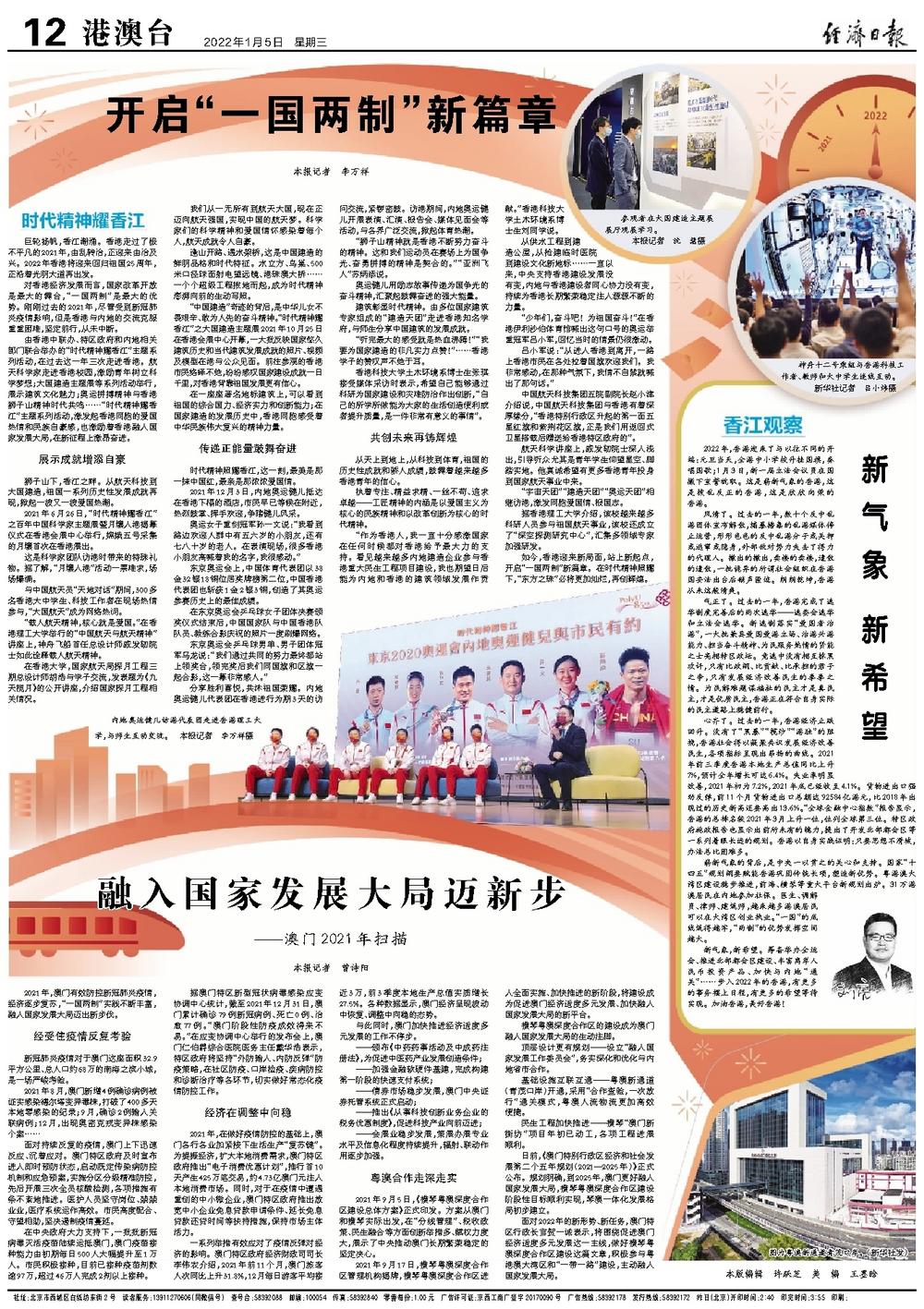 面对2022年的新形势、新任务,澳门特区行政长官贺一诚表示,将围绕促进澳门经济适度多元发展这一主线,做好横琴粤澳深度合作区建设这篇文章,积极参与粤港澳大湾区和“一带一路”建设,主动融入国家发展大局。