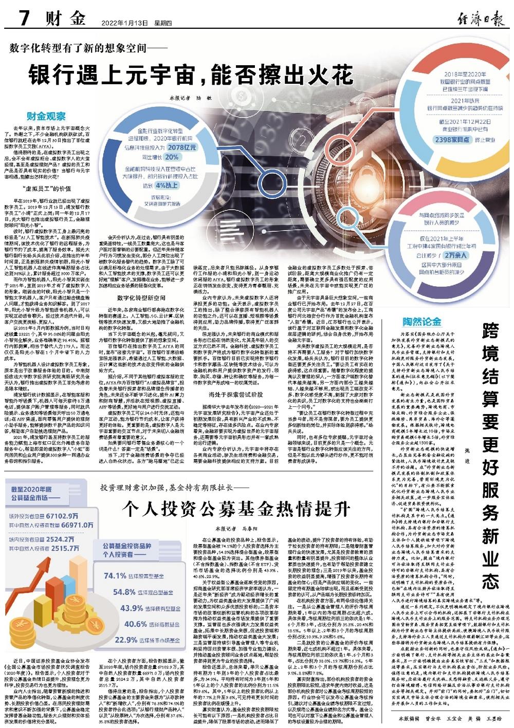 未来数字虚拟员工的大规模运用,是否将不再需要人工服务?对于银行加快数字化发展,杨兵兵认为,银行目前的数字化转型还要更多关注员工。“要让员工有实在的获得感,这点很重要。随着数字化程度的提高以及管理的深入,一方面客户端数字化替代率越来越高,另一方面内部分工越来越细、人越来越不够用,或出现员工端改变不多、数字化感受度不高,割裂了大家对数字化的共识,员工对数字化的支持也会渐渐打上一个问号。”