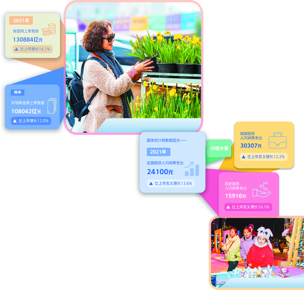 最新数据显示,2021年我国网上零售额130884亿元,比上年增长14.1%。其中,实物商品网上零售额108042亿元,同比增长12.0%,占社会消费品零售总额的比重为24.5%。多位专家表示,展望2022年,线上线下融合将继续催生新的消费模式,使线上实物零售额增长得以保持,并为实体零售业数智化转型创造有利条件。