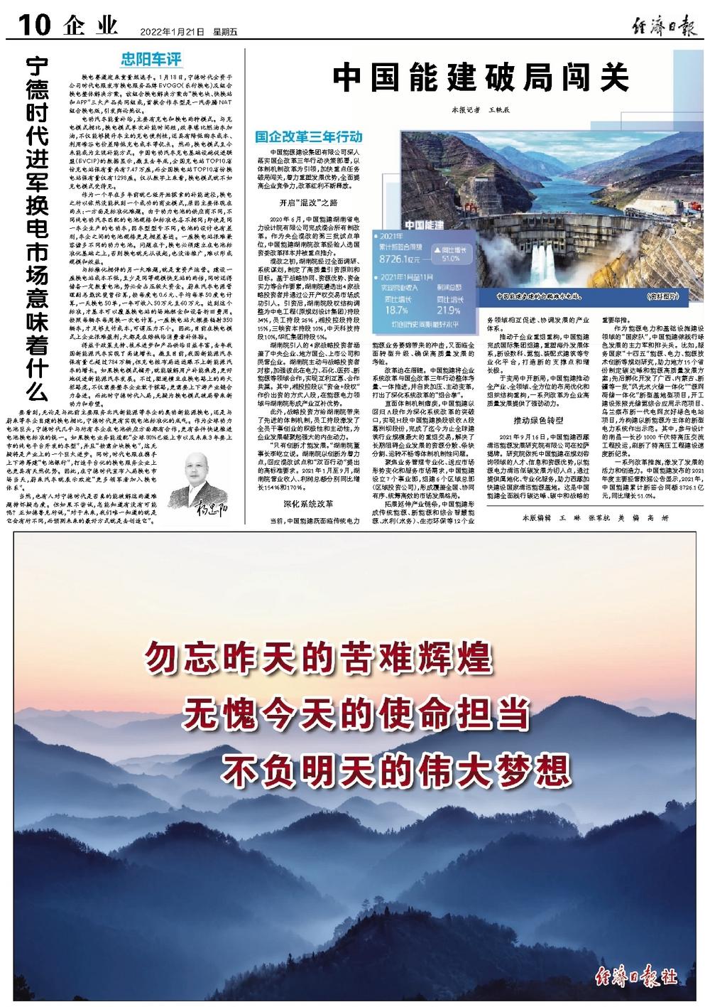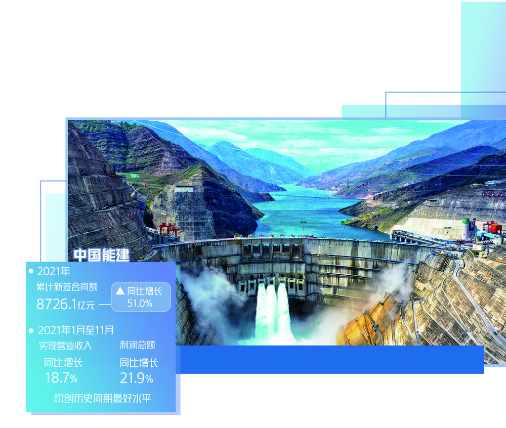 一系列改革措施,激发了发展的活力和创造力。中国能建发布的2021年度主要经营数据公告显示,2021年,中国能建累计新签合同额8726.1亿元,同比增长51.0%。