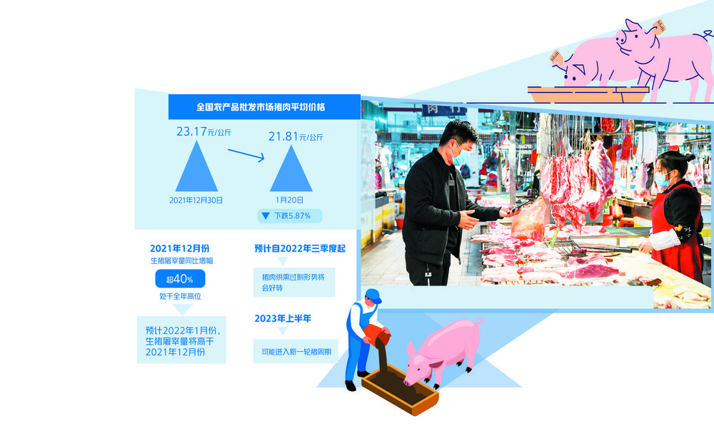 农业农村部监测数据显示,1月20日,全国农产品批发市场猪肉平均价格为21.81元/公斤,比2021年12月30日的23.17元/公斤下跌了5.87%。