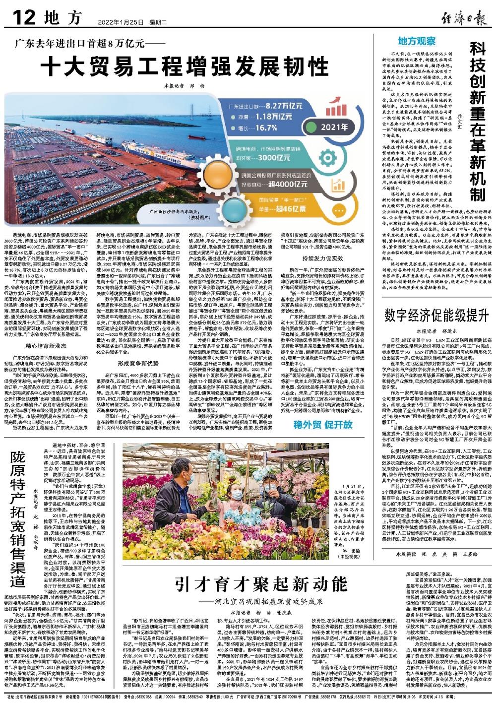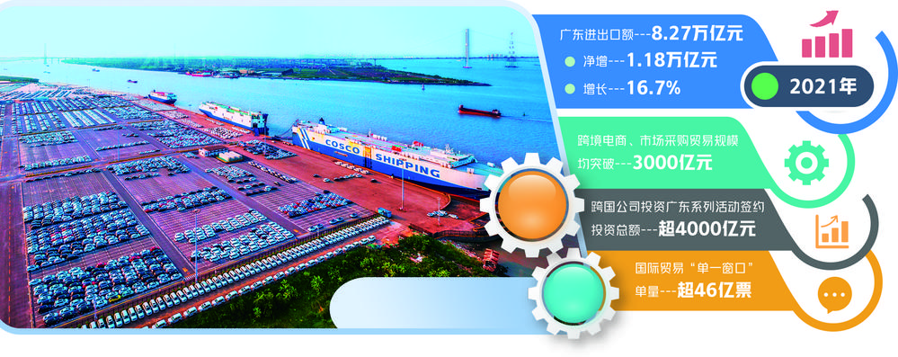跨境电商、市场采购贸易规模双双突破3000亿元,跨国公司投资广东系列活动签约投资总额超4000亿元,国际贸易“单一窗口”单量超46亿票、占全国51%……2021年,广东不仅稳住了外贸基本盘,外贸发展更涌动着澎湃新动能,实现进出口额8.27万亿元、增长16.7%,首次迈上8万亿元的标志性台阶,一年净增1.18万亿元。
