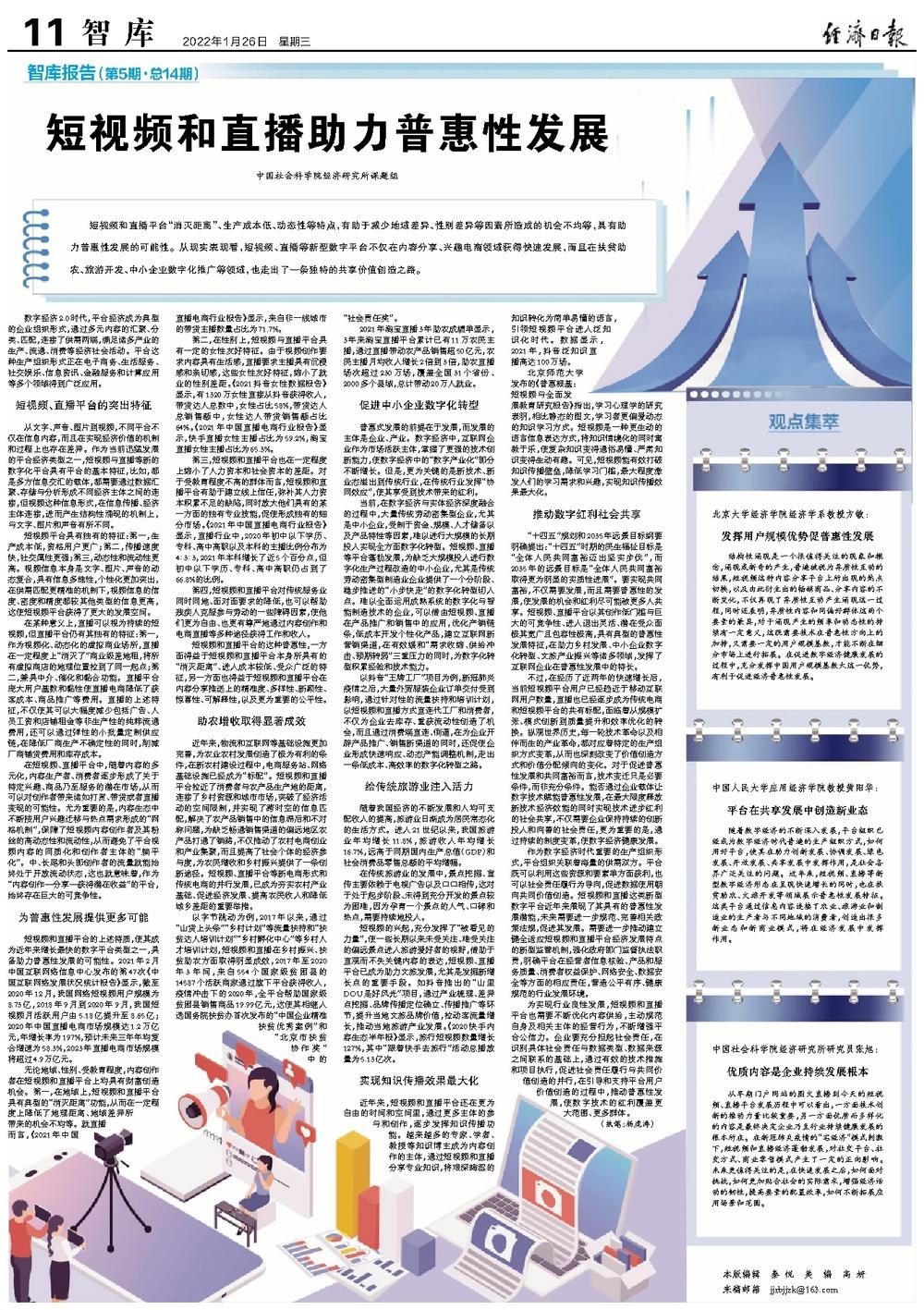 短视频和直播助力普惠性发展 中国社会科学院经济研究所课题组 2022年01月26日