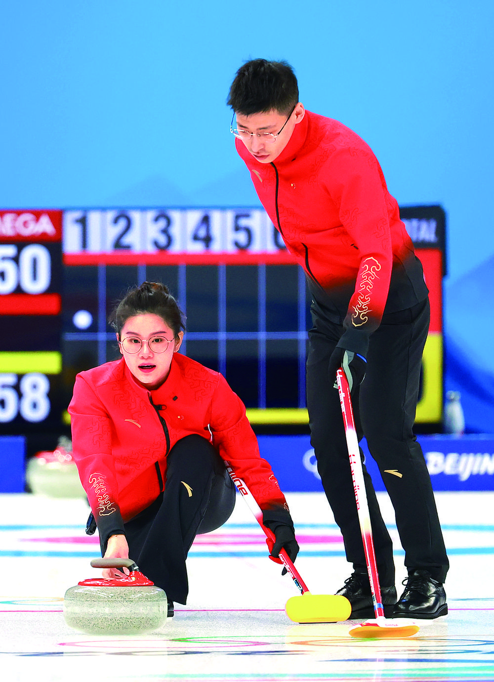 2月2日,中国冰壶队范苏圆(左)和凌智在比赛中。当日,北京冬奥会冰壶混双循环赛在北京国家游泳中心“冰立方”开赛。中国组合凌智/范苏圆发挥稳健,通过加赛局7:6击败平昌冬奥会亚军瑞士队,为中国冬奥军团打响头炮。新华社记者 刘 续摄