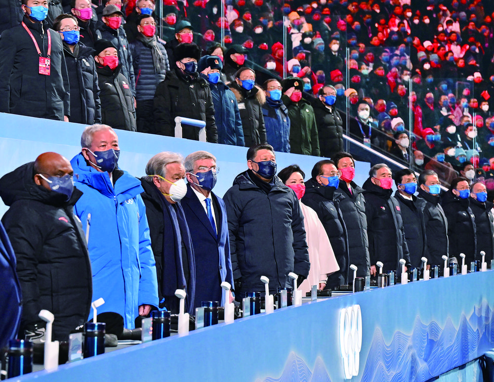 李克强、栗战书、汪洋、王沪宁、赵乐际、韩正、王岐山等党和国家领导人,国际奥委会主席巴赫,以及来自世界各地的领导人和贵宾出席开幕式。